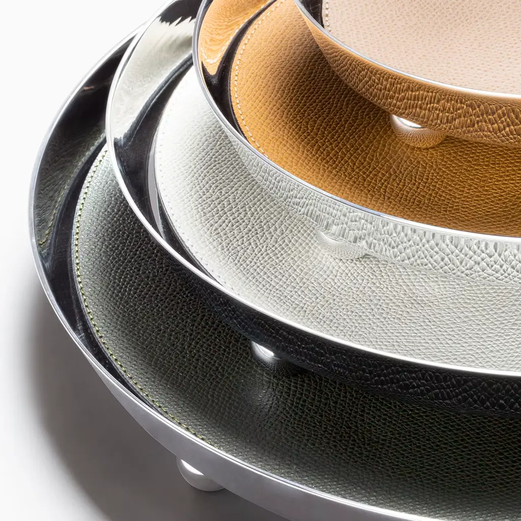 Metal structure with metal rounded feet available in different finishes. Provided with removable leather placemat. Metal finishes available: chrome / bronze / brass.