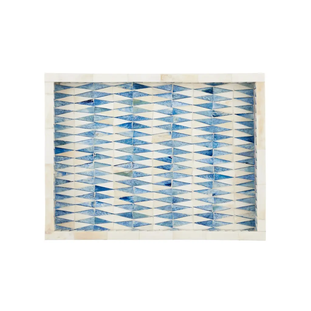 The Nadene Tray is a decorative tray made of alternating colors of bone. The jagged pattern is created when blue and ivory colored bone is hand-applied to the surface, which makes the blue tray an artisanal accessory that packs a textural punch. Place this lovely decorative accessory on a kitchen island or a buffet and it will be a dynamic accent whether or not it holds any meal-specific elements. Ships In 7-10 Business Days This image is for illustrative purposes only. The colors shown are accurate within the constraints of lighting, photography, and the color accuracy of your screen.