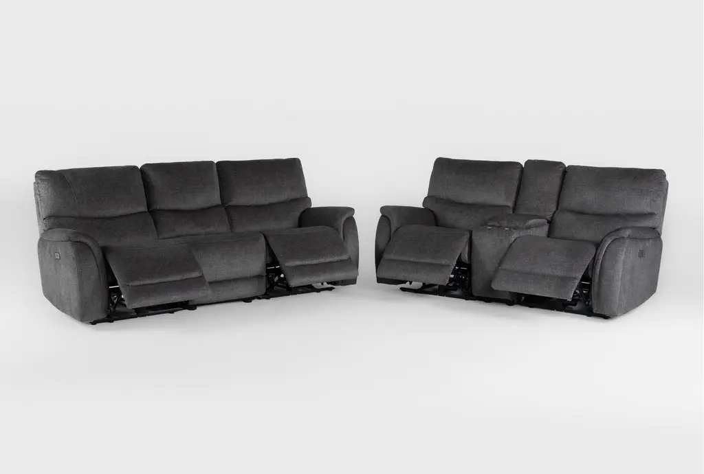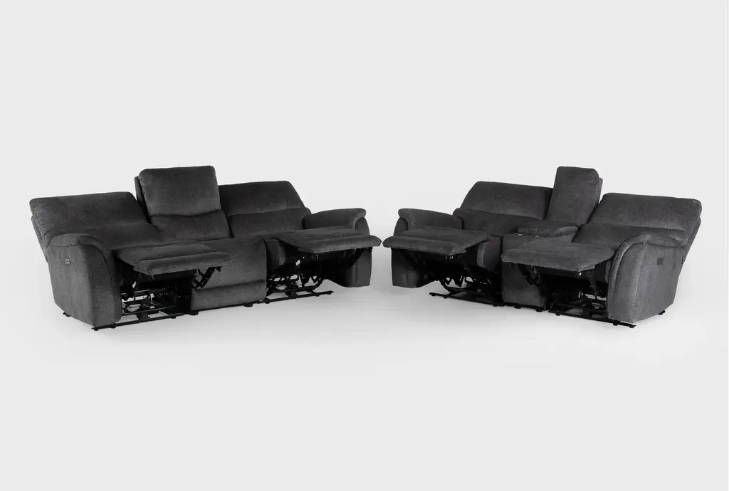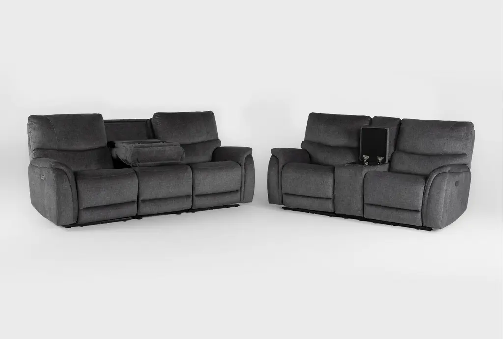 The Nash 6 Piece Power Reclining Modular Drop Down Tray Sofa and Console Loveseat Set is perfect for a casual living room. This modular set features a gunmetal fabric that complements any decor. Designed for comfort and functionality, it's ideal for relaxing and entertaining.