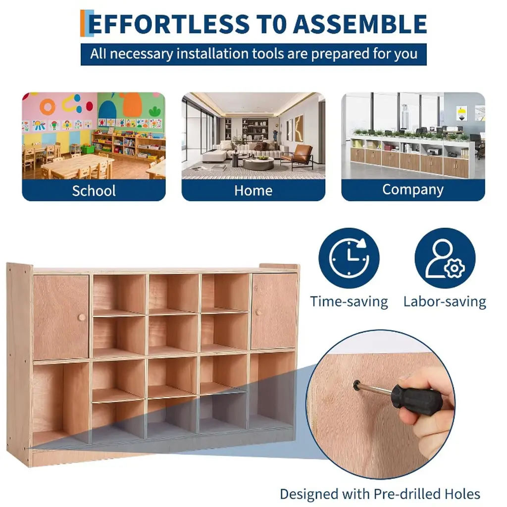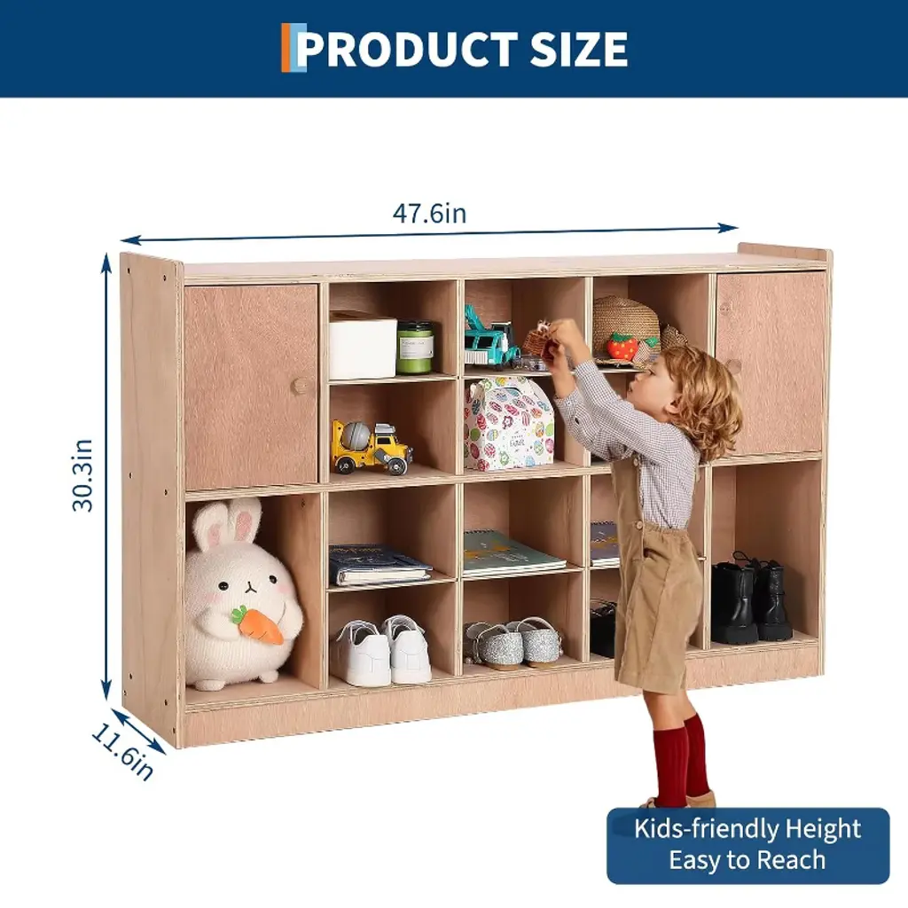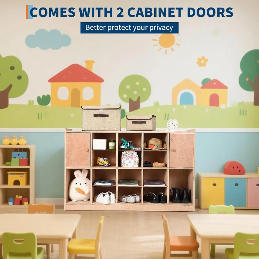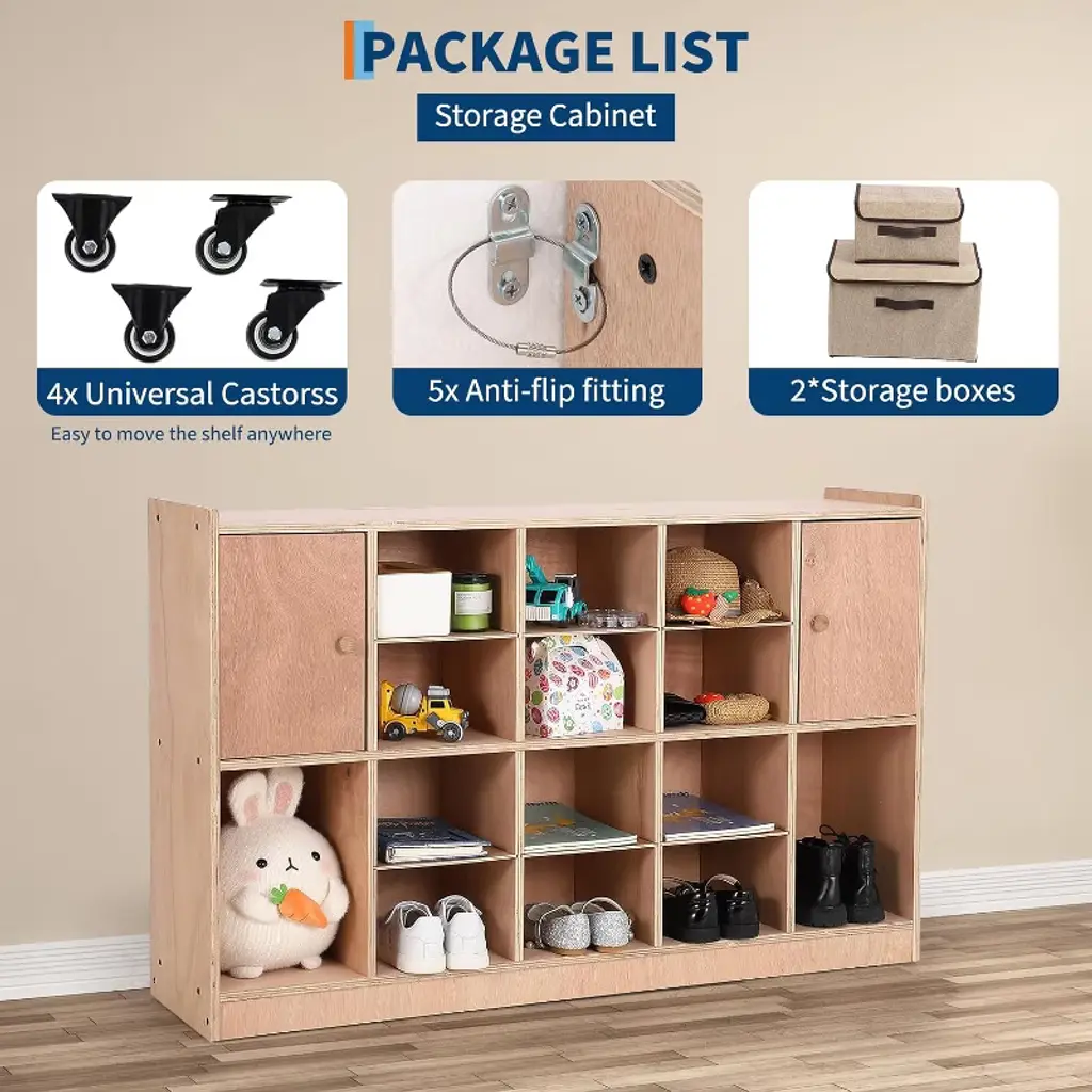 14 Cubby Mobile Tray Storage Cabinet with 2 Cabinet Doors, Storage Organizer Cubes with 2 Anti-Flip Fittings,4 Castors and 2 Boxes for Home, School, Kindergarten