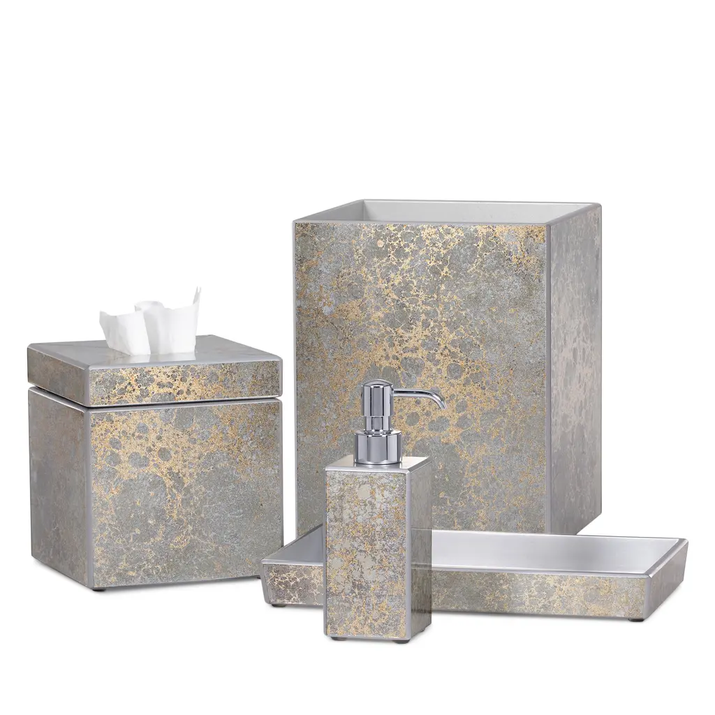 Elegant in shimmery tones of silver and gold, the Natasha Bath Collection from Labrazel features reverse-painted glass panels mounted on sturdy wood frames. The exquisite pieces lend an air of upscale sophistication to your room.