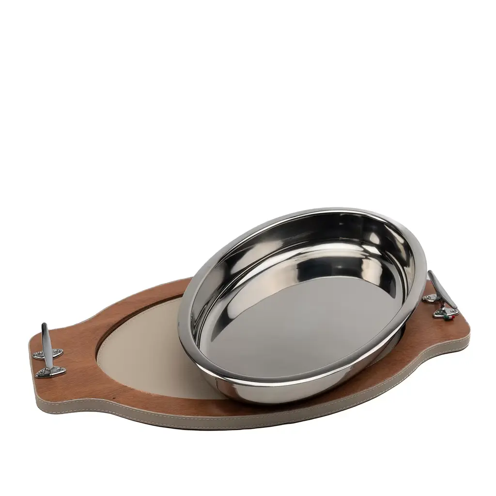 Distinguished by its maritime-inspired design, this large oval serving tray marries the warmth of wood with the sleekness of steel. The wooden platform, reminiscent of the sturdy decks of boats, provides a charmingly rustic backdrop for any dish. Meanwhile, the steel handles, echoing the utilitarian elegance of nautical furnishings, offer a secure and stylish grip. Inspired by the artist's passion for maritime themes, it embodies the timeless allure of the sea, making it a captivating addition.