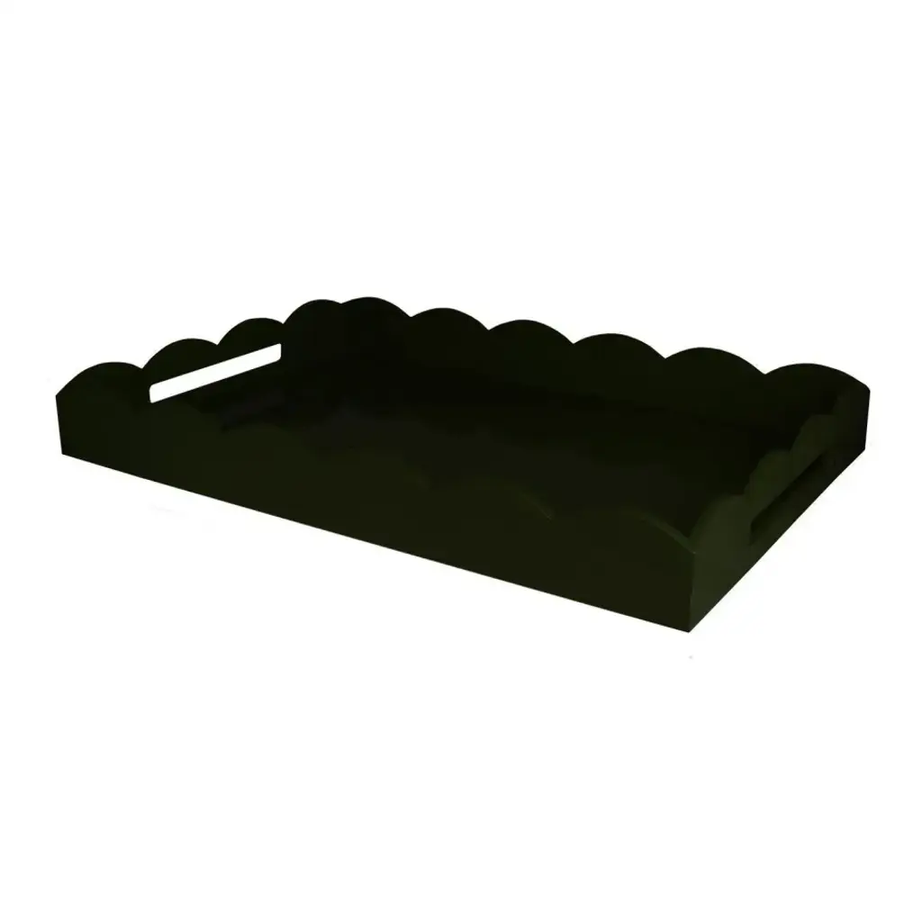 Our 11 x 8" Navy Lacquer Scalloped Tray is finished with 20 coats of high gloss, carefully polished by hand in between each coat. The base is lined in a cream velvet and is embossed with our logo.