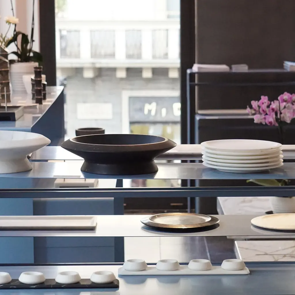 A sculptural shape for a container. Colominas’ project accomplishes curved marble that lends itself to carrying sauces or oils with designs that are always different. The item includes four white Michelangelo marble small bowls.Size: 39.4 x 9 x 1 cm (Tray) 7.4 x 2.5 cm (Bowl), smooth finishing. Commercial name: Polychrome (Tray) and Thera (Bowls) - Materia e Tavola Collection, by the Spanish Designer Ivan Colominas. Tray also available in white Michelangelo marble. Made in Italy, hand finished.MMAIRO marble products are made of valuable materials and need to be handled with care. Any difference between similar objects and from their picture on the catalogue are due to the nature of the marble, and costitute an additional value of each piece, making it truly unique and special. The contact with acid or corrosive substances may adversely affect the surface. Hand washing is recommended. Special stain treatment, where necessary food compatible.