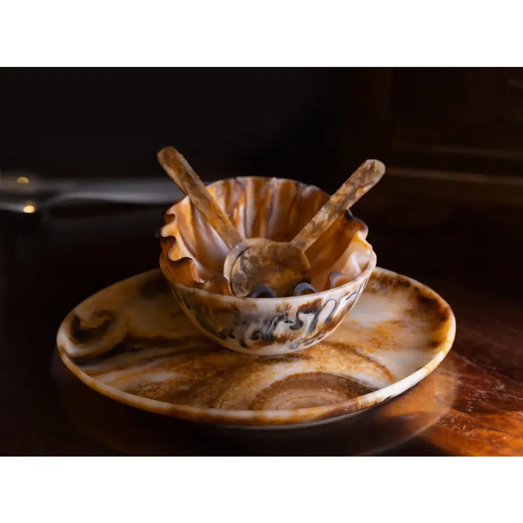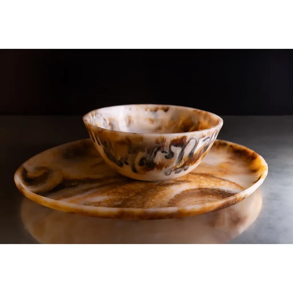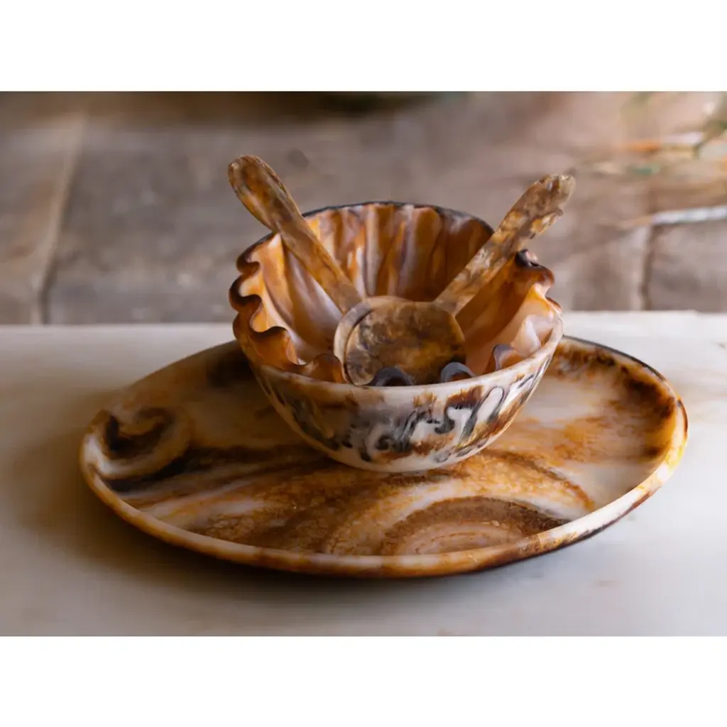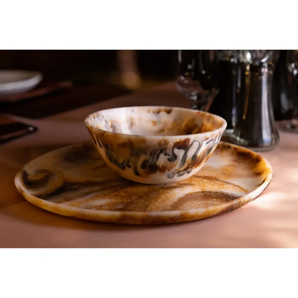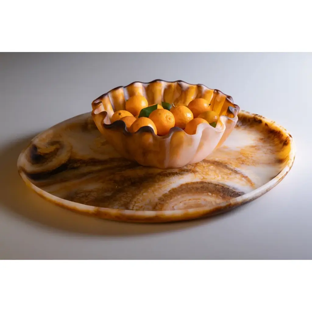 Swirl + style. Designed for ottomans and coffee tables, this round resin tray features a marbled mix of amber and cream tones that mimic natural stone. Its glossy finish brings organic movement to indoor or outdoor spaces – just skip the snacks, it’s not food-safe.