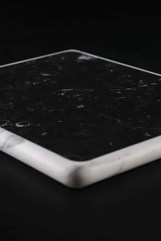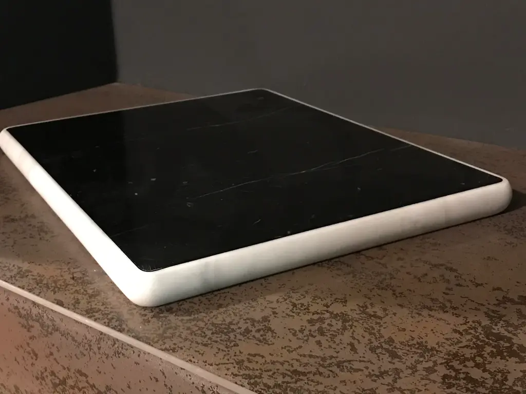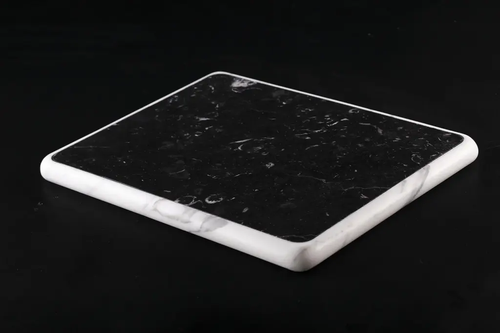 This tray is made of white Carrara marble with inlaid black Marquina marble. Labeled by Maker,Labeled by Maker