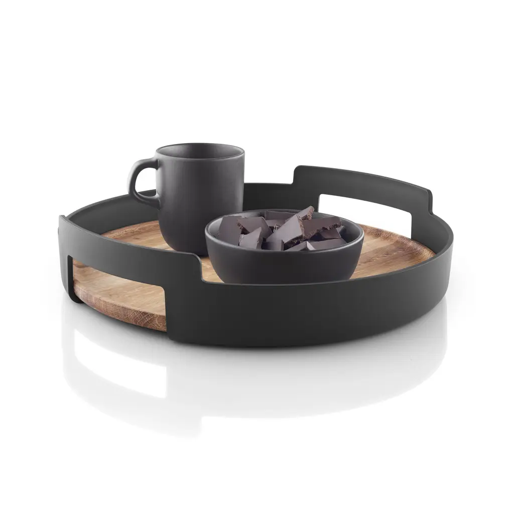 The serving tray is both stylish and practical with raised edges and handles that ensure a secure grip. Made from oak and matt black plastic, the serving tray has an exclusive and timeless look with a beautiful finish. It is easy to wipe clean with a damp cloth. Oil regularly to preserve the wood.