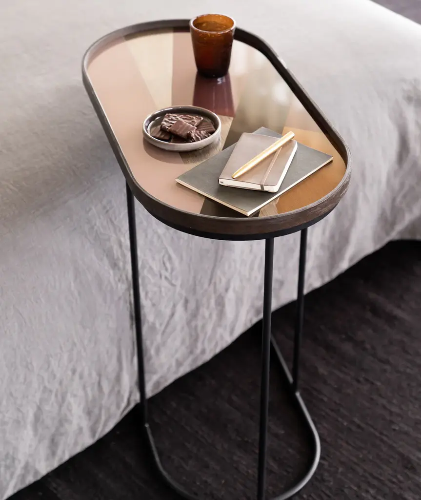 Overlapping shapes and colors create the tranquil rhythm in the Composed Angles collection. Featuring a layered composition, the screen-printed glass design features translucent and opaque layers that seem to define the next, creating an unexpected harmony. Designed by Dawn Sweitzer, each tray fits perfectly with a tray table or rests nicely on a tabletop or shelving. To be combined with Oblong Tray Side Table, shown here.