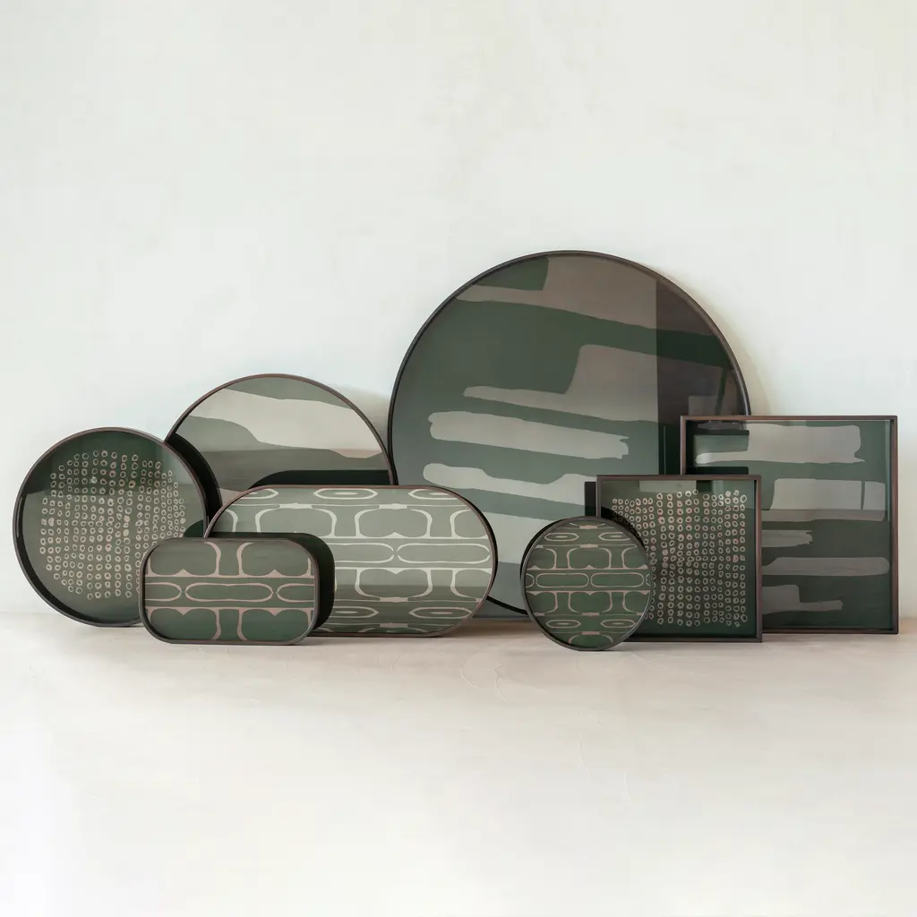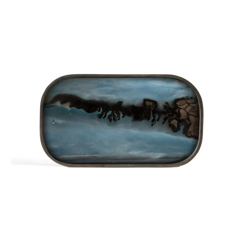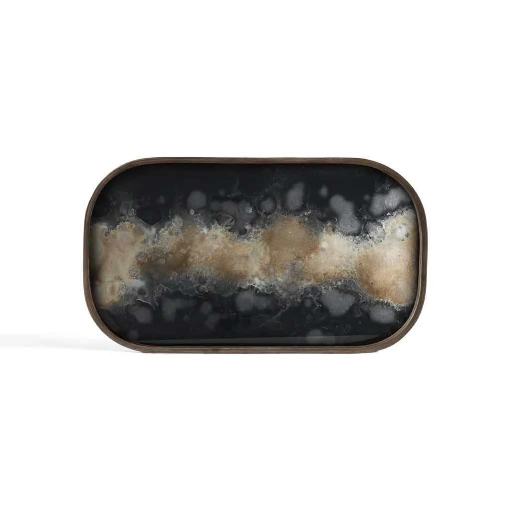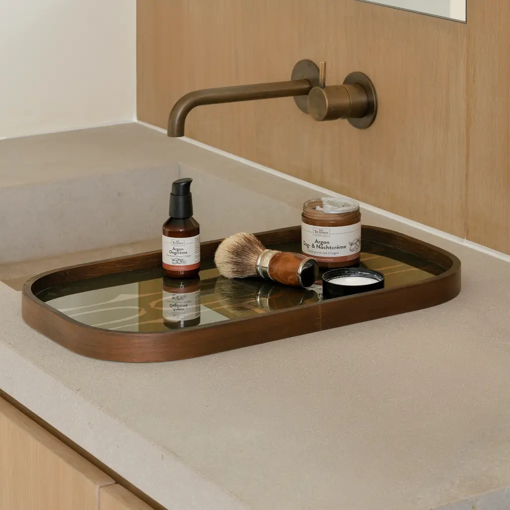 Indulge in sophisticated organization with the Oblong Valet Tray from Ethnicraft. Inspired by the organic shapes and abstract shadows of nature, each tray features hand-printed glass layered over warm wood. With a harmonious blend of elegance and functionality, it adds quiet sophistication to any space. Use to keep makeup and skincare organized in the bathroom, or as a catchall for daily essentials on an entryway console table. Highlights
