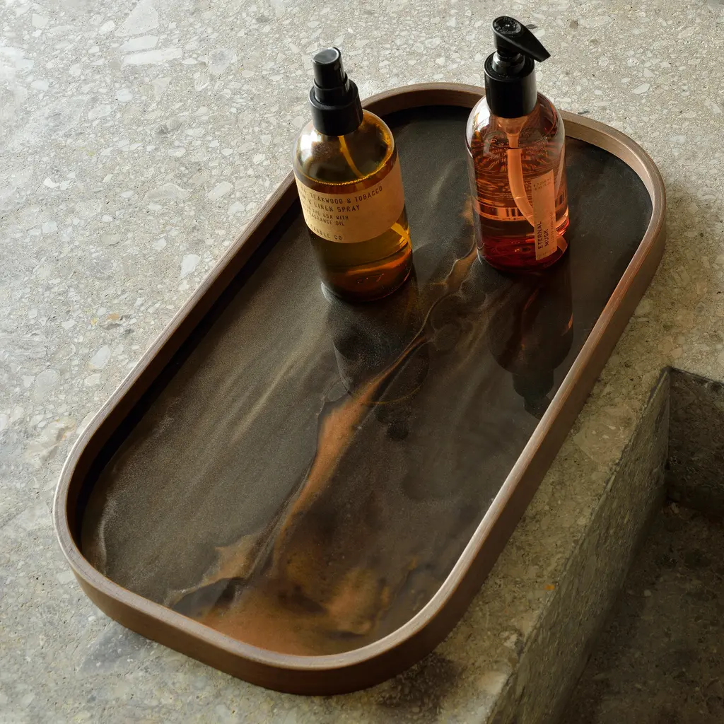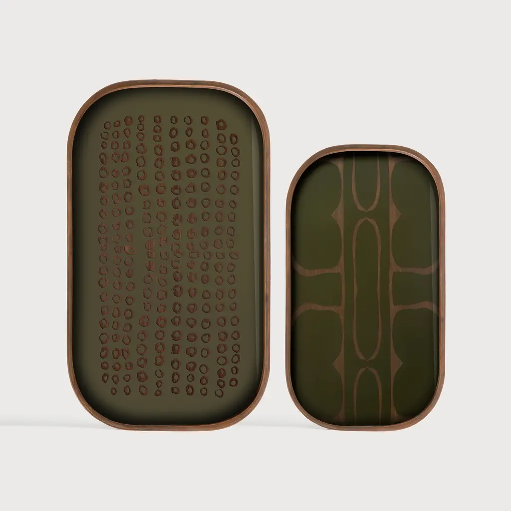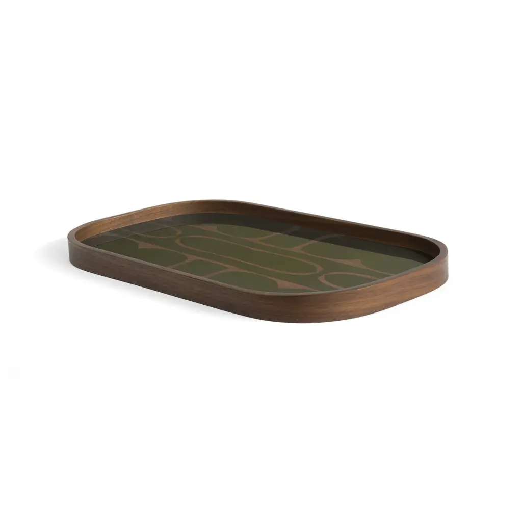 Indulge in sophisticated organization with the Oblong Valet Tray from Ethnicraft. Inspired by the organic shapes and abstract shadows of nature, each tray features hand-printed glass layered over warm wood. With a harmonious blend of elegance and functionality, it adds quiet sophistication to any space. Use to keep makeup and skincare organized in the bathroom, or as a catchall for daily essentials on an entryway console table. Highlights