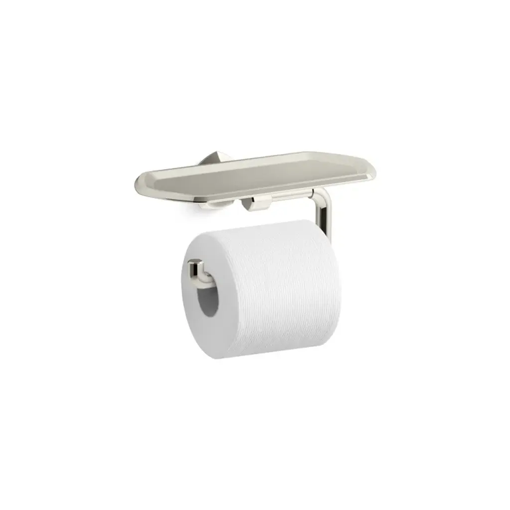 Unapologetically luxurious and truly unforgettable, Occasion bathroom accessories draw inspiration from 1960s Hollywood glamour and extravagance. Fashioned after the era’s sleek dress lines and bold car designs, the Occasion collection reflects graceful elegance, blending classic midcentury style with modern design. Customize your bathroom with the collection’s distinctive pentagonal accents, faceted bases, flowing lines, and delicate edges. The toilet paper holder with storage tray adds elegance and function to your space—in finishes to match your faucet and other accessories.
