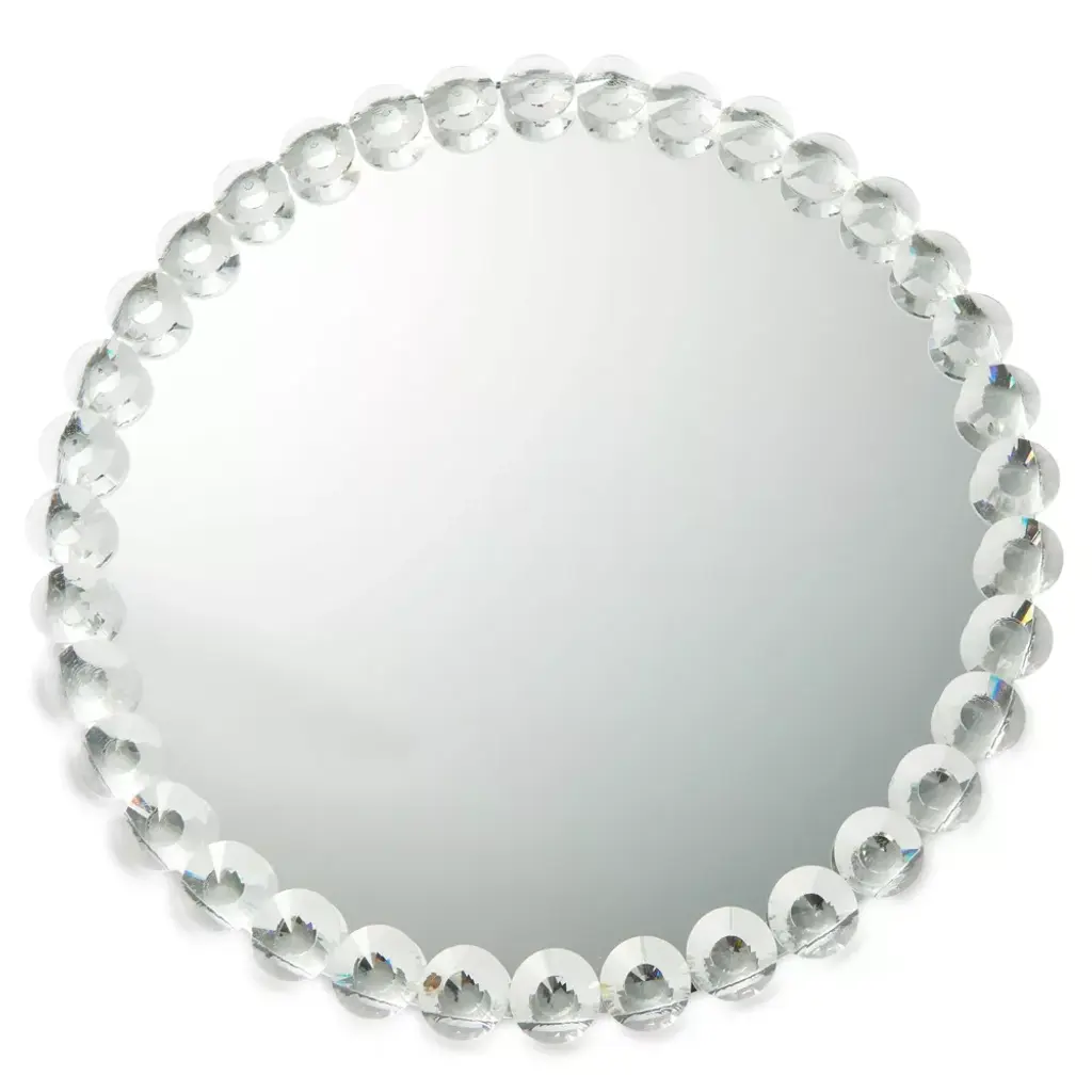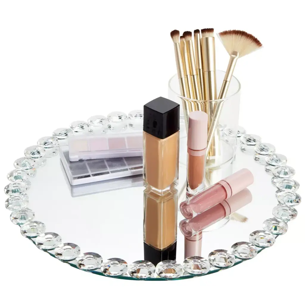 Okuna Outpost Crystal Bead Mirrored Tray for Perfume, Vanity Organizer Serving Platter, Round, 12 in