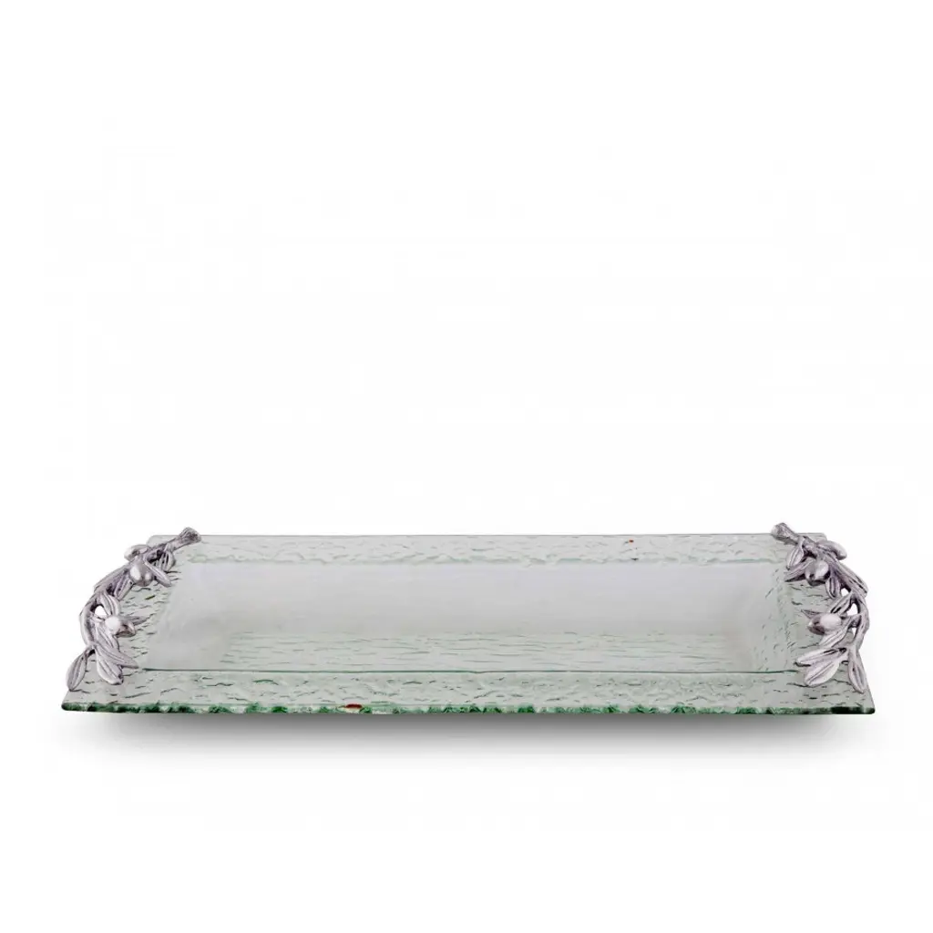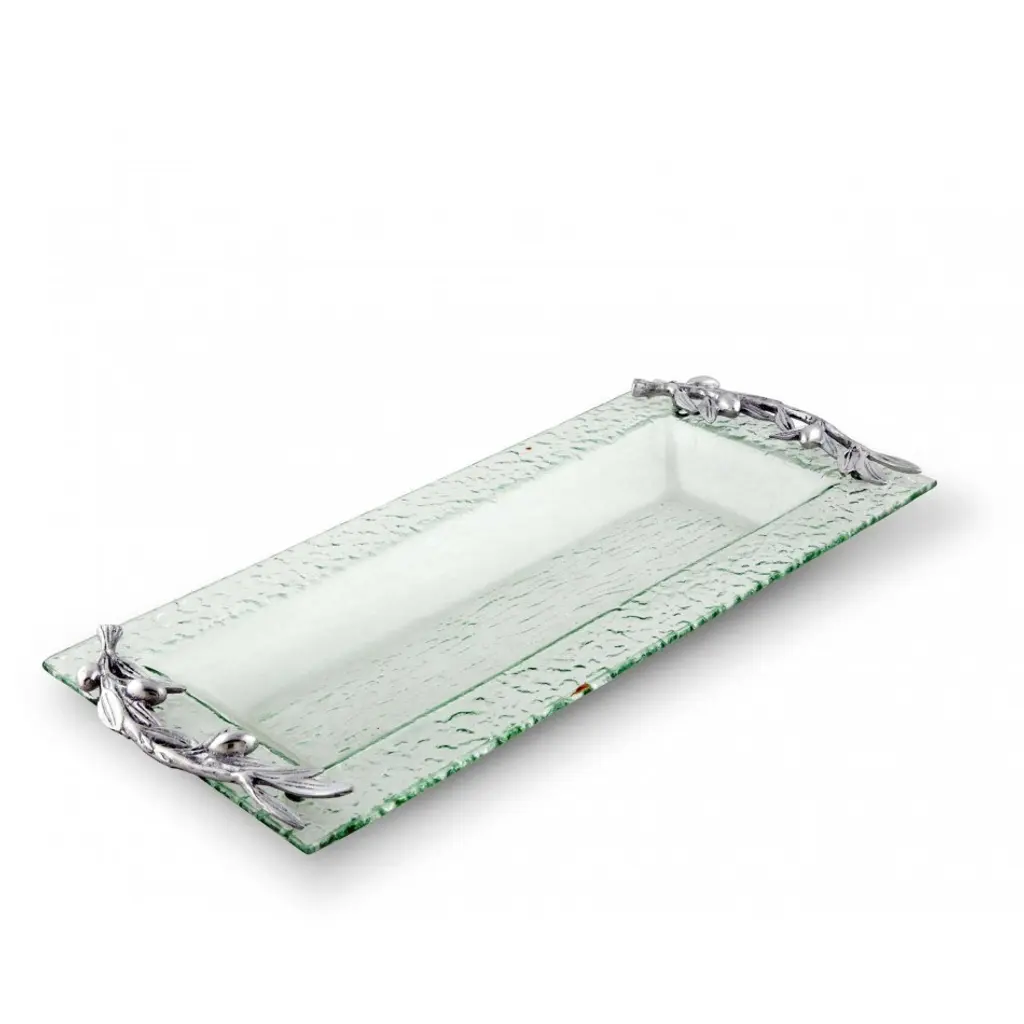 Inspired by the beauty of Tuscany, this uniquely designed glass oblong tray with artfully handcrafted olive branch handles, creates a beautiful mediterranean atmosphere on every table.