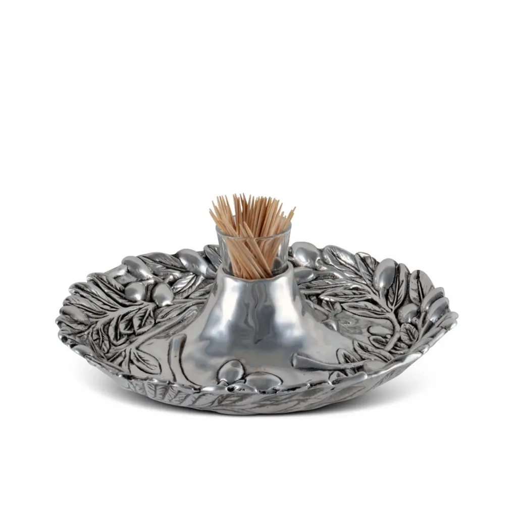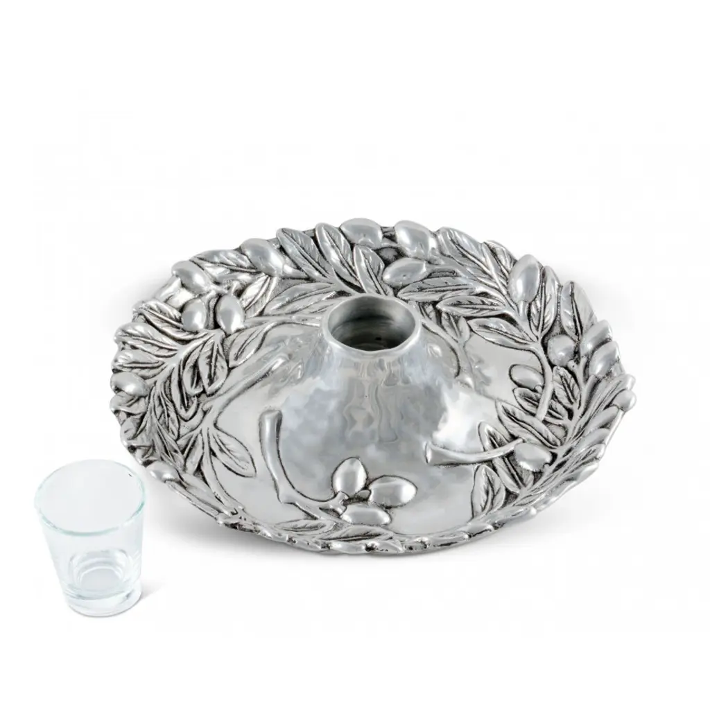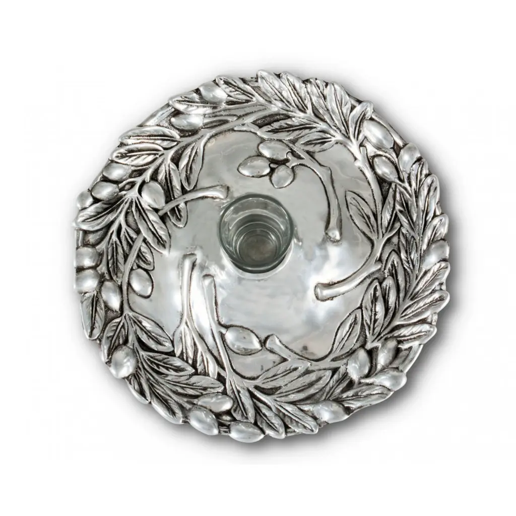 Round coupe tray with interesting edges features a raised wreath design of olives on leafy branches. Inspired by olive groves of the Mediterranean coast, our tray adds Tuscan style to your table and home. Featuring a raised votive-sized glass holder emerging from a center bloom, this tray is a stunning way to serve an assortment of crudités, nuts, olives or any tidbit collection. The glass holder in the middle will hold picks, hors d'oeuvres forks or even a tealight candle.