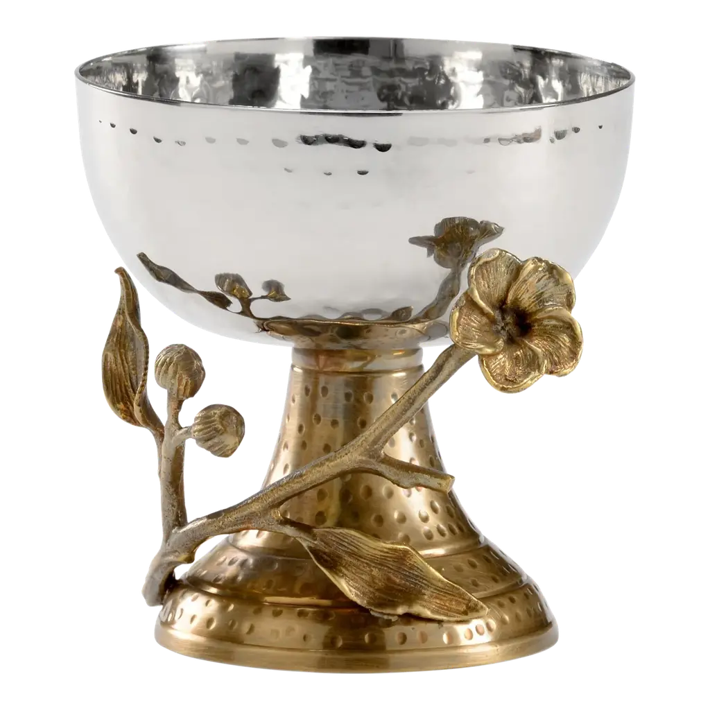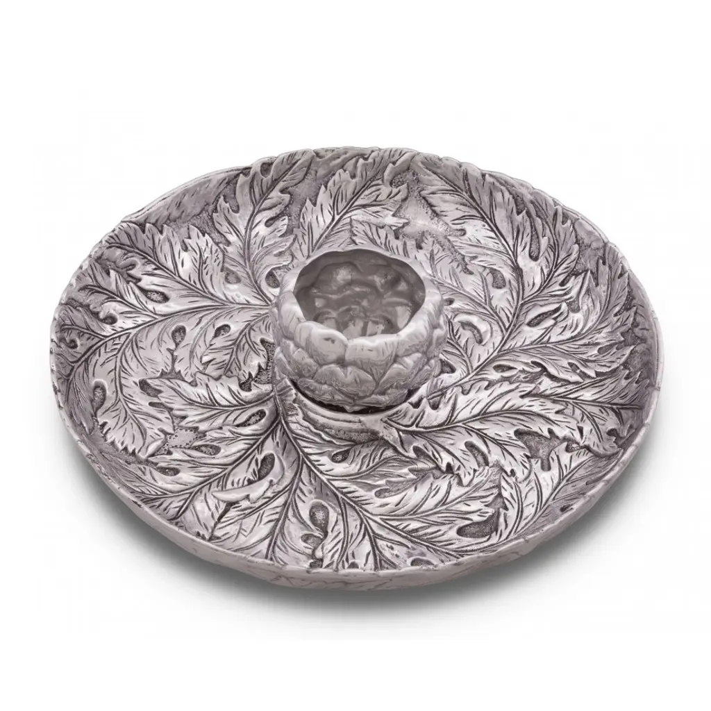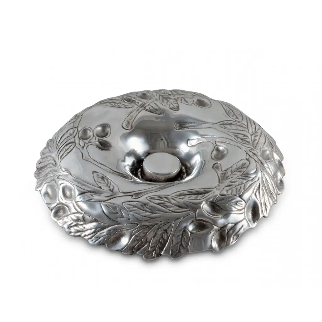 Round coupe tray with interesting edges features a raised wreath design of olives on leafy branches. Inspired by olive groves of the Mediterranean coast, our tray adds Tuscan style to your table and home. Featuring a raised votive-sized glass holder emerging from a center bloom, this tray is a stunning way to serve an assortment of crudités, nuts, olives or any tidbit collection. The glass holder in the middle will hold picks, hors d'oeuvres forks or even a tealight candle.