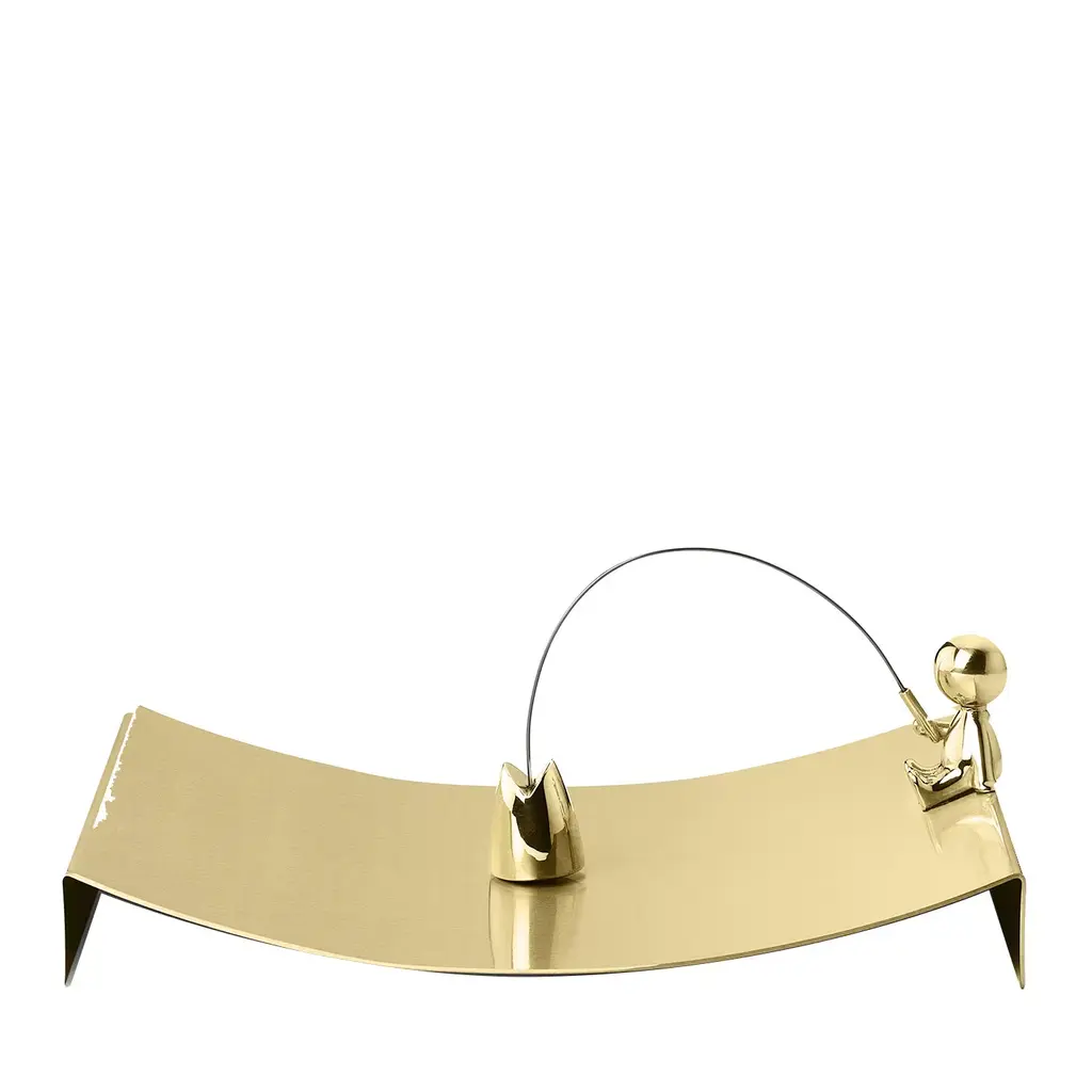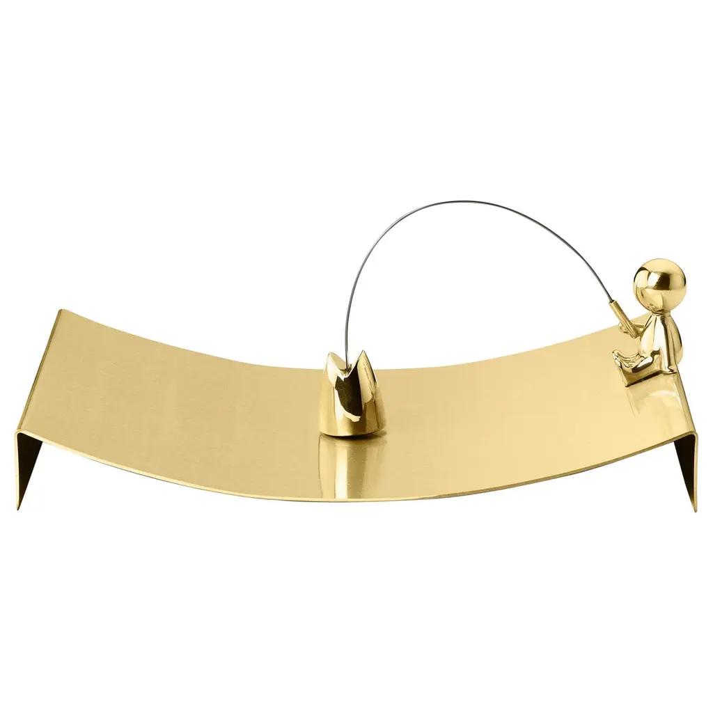 This striking pen and card tray will add effortless elegance on a desk in a modern or classic office. The minimalist frame is marked by an upside-down V-design and a ridged base. As a unique finishing touch, a small figurine of a man effortlessly hangs over the top tray, seemingly peering down at the contents. This elegant object can be arranged with other pieces from the Omini collection to add whimsical flair on a desk in a private studio, and will be the perfect graduation or housewarming gift.