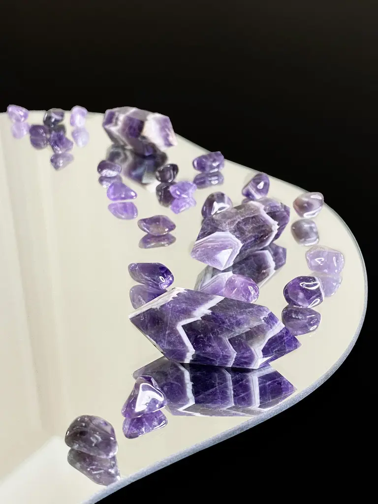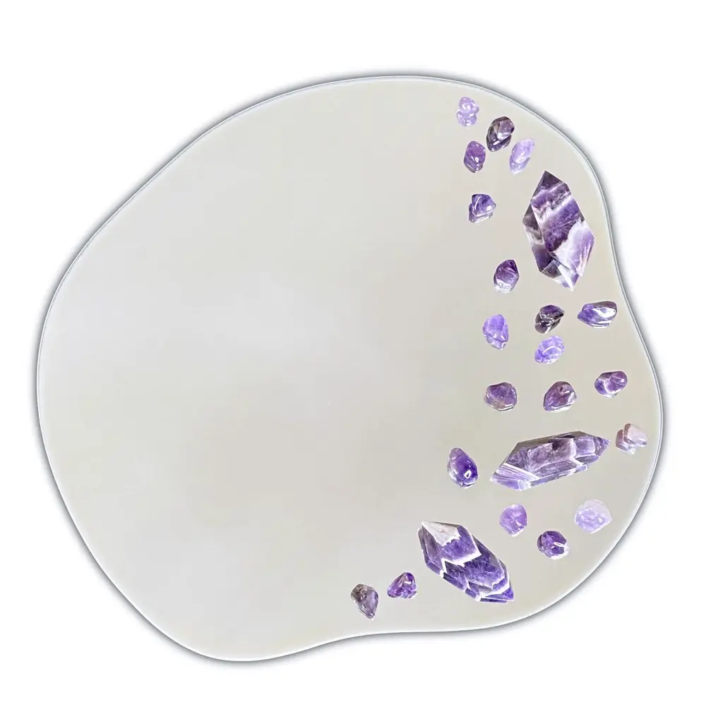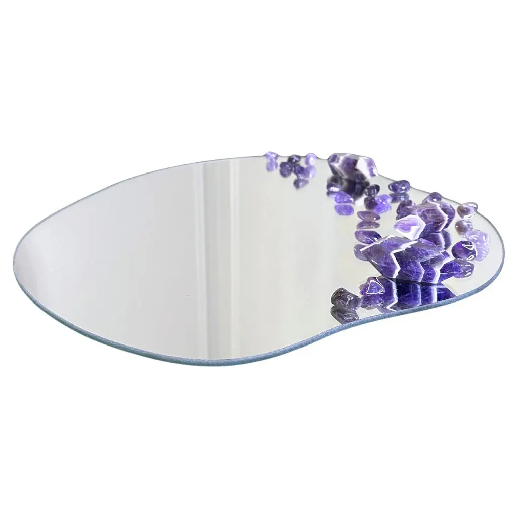 Organic mirrored tray adorned with amethysts.Number of stones: 23 amethystsLimited and numbered and signed editionEach mirror is unique, just like the people who will own them. They are distinguished by the unpredictable and harmonious arrangement of a panel of semi-precious stones. Each arrangement of stones creates a shape of its own. Aline's creations, beyond sharing her passions with the world, aim to bring beneficial and soothing energies to the heart of our homes. All of her collections are inspired by the creative harmony that, as in nature, produces forms whose beauty is rare, unique and precious.The stone used for this work is the amethyst. It is a semi-precious stone associated with many virtues, including:The ability to calm the mind and promote meditation, helping to find inner peace and reduce stress and anxiety. Amethyst is also considered a stone of protection, capable of purifying the surrounding energy and blocking negative energies. It is associated with wisdom and clarity of mind, helping to make more informed decisions and better understand complex situations.