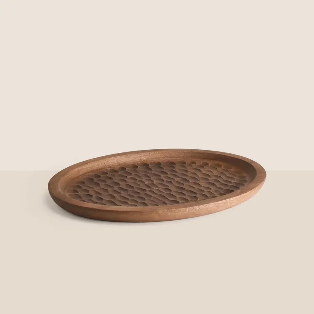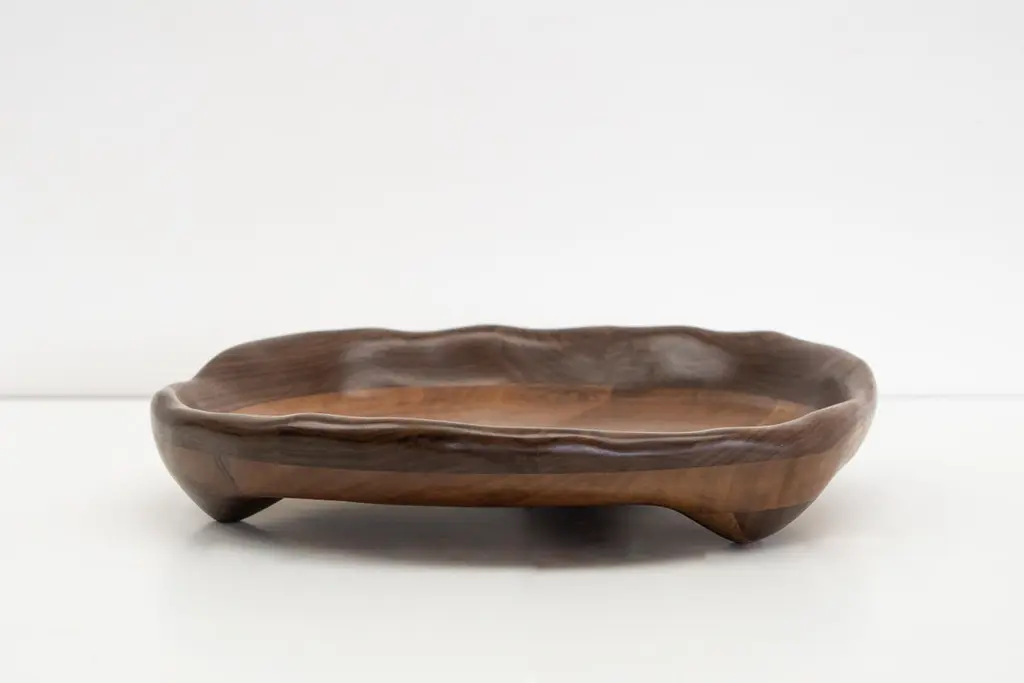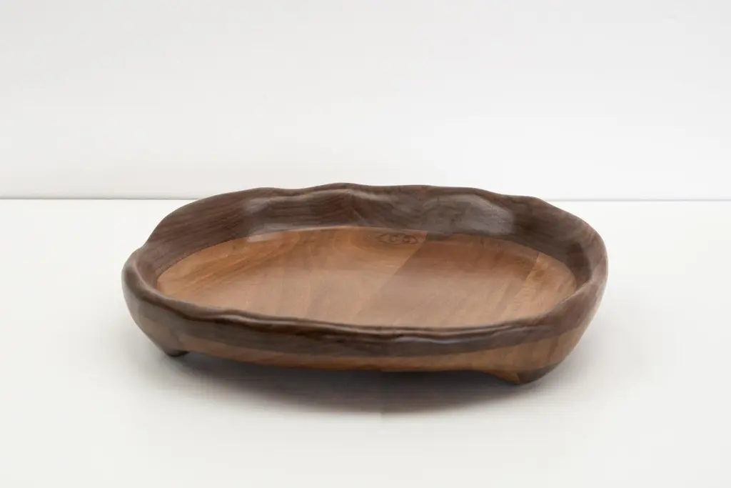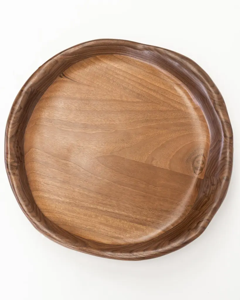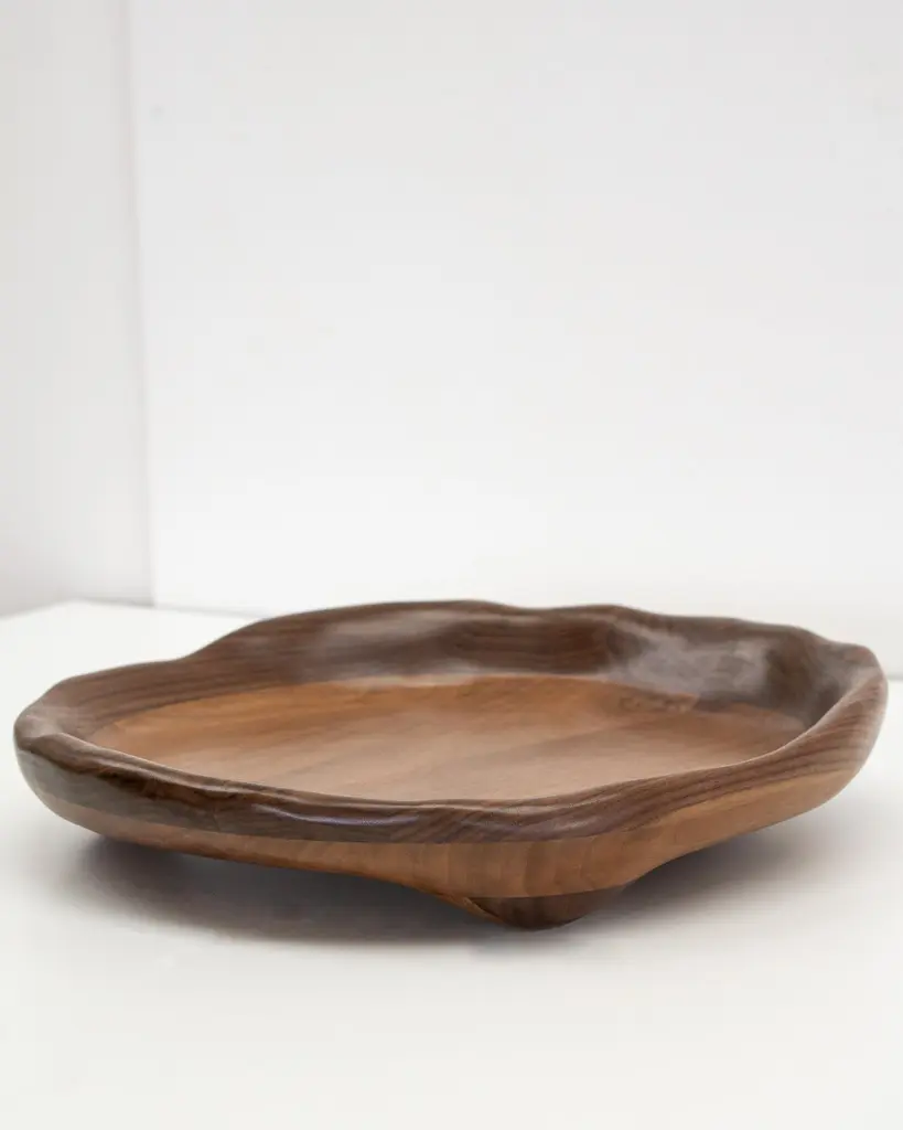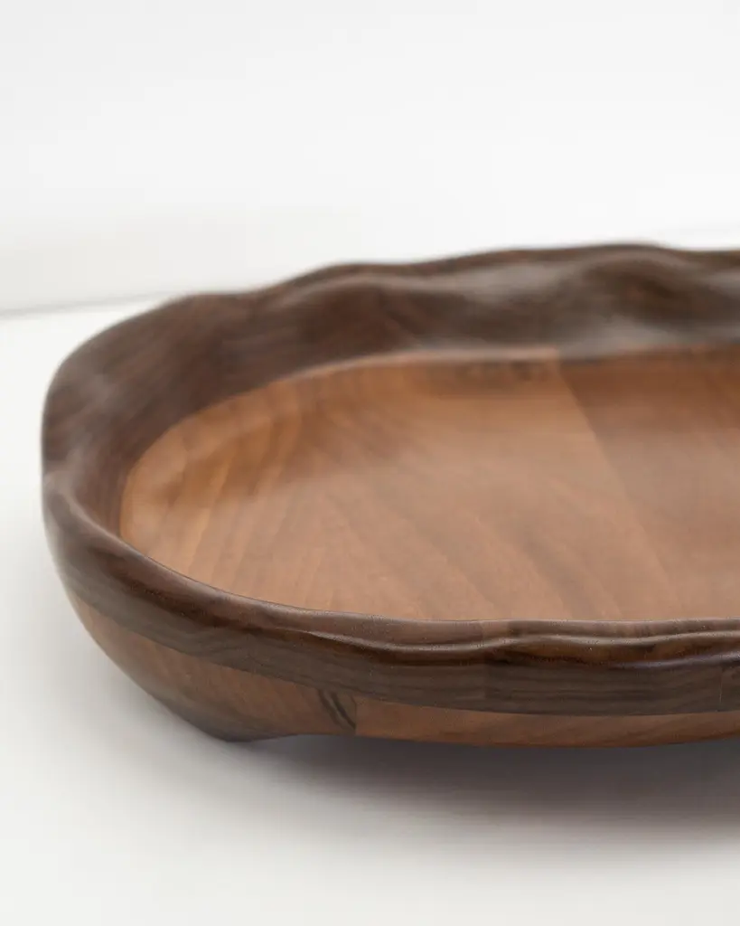 The serving tray is shaped using various hand tools, making each piece unique with its own distinctive wood grain. It is made from walnut wood and finished with a food safe hardwax oil.The serving tray can also be customized according to your preferences:- Size- Wood type: Walnut, Oak, Maple, Charred Oak