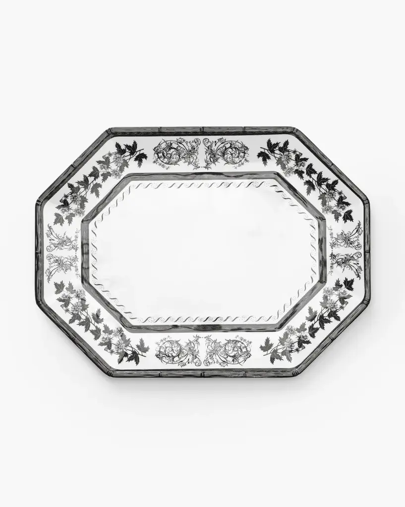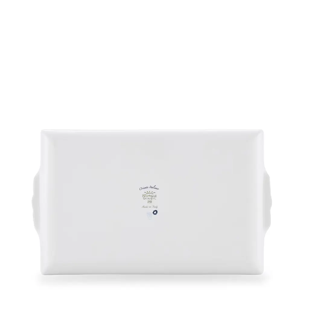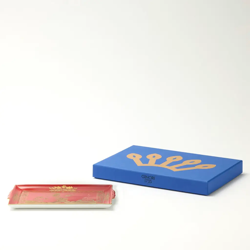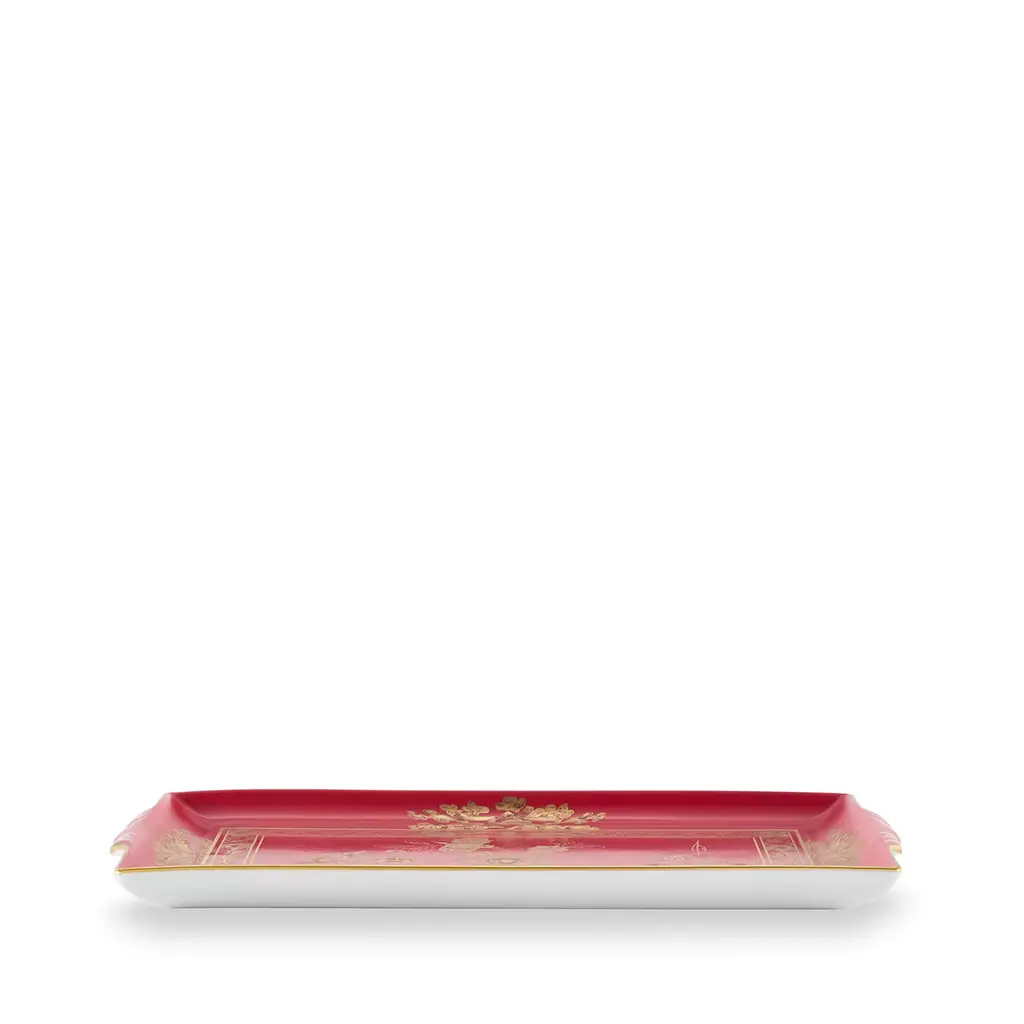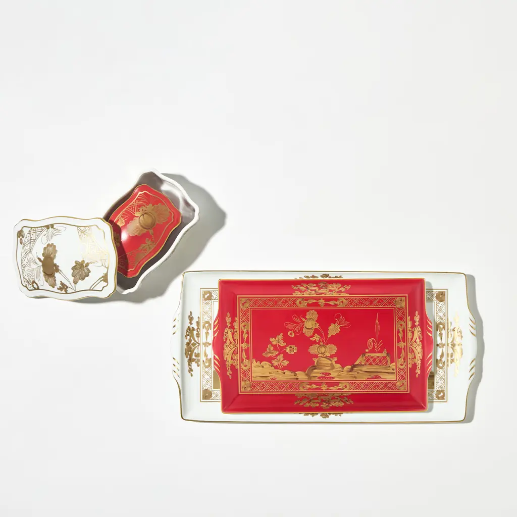 This small red rectangular tray with handles, in the Rubrum pattern with floral patterns and gold trim, embodies the art of hospitality. Featuring red-colored handles, it’s perfect as a centerpiece, for serving hors d'oeuvres or desserts, or as a base for candles and flowers to create a refined ambiance. Part of the Oriente Italiano collection, it showcases a blend of timeless craftsmanship and vibrant Asian-inspired aesthetics, transforming each porcelain piece into an enchanting work of art.