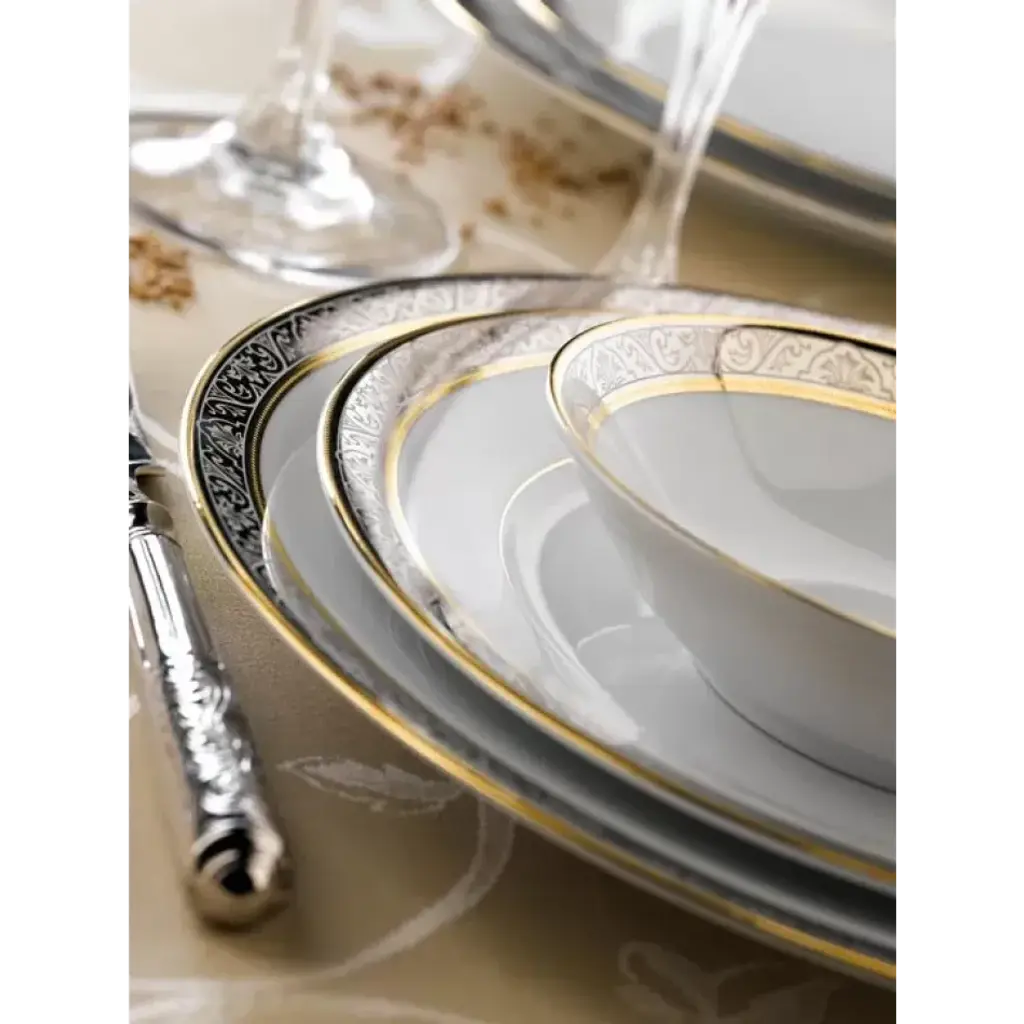 The Orleans dinnerware collection is distinguished by the hand-decorated gold and platinum borders. Five piece place setting includes dinner plate, dessert plate, bread & butter plate, teacup and saucer. Founded in 1826, Deshoulières is the leading French porcelain maker today. Their fine white Limoges porcelain is strong enough for everyday use. Their style is well known around the world. The painters and decorators have generations of knowledge. Inspired by trends from both interiors and fashion, their patterns are always refined. Deshoulières embodies a true spirit of French style. With their new collections, Deshoulières delights everyone from homeowners to professional chefs. Invite elegance to your table with Deshoulières.