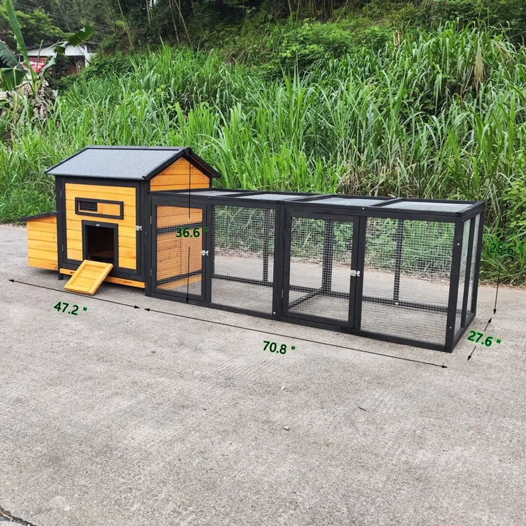 This spacious 118" wooden chicken coop offers a safe, comfortable home for your flock! Features nesting boxes, leak-proof pull-out tray for easy cleaning, durable asphalt roof, and free-range access doors. Ideal for backyard farms – provides ventilation, security, and weather resistance for happy, healthy poultry!