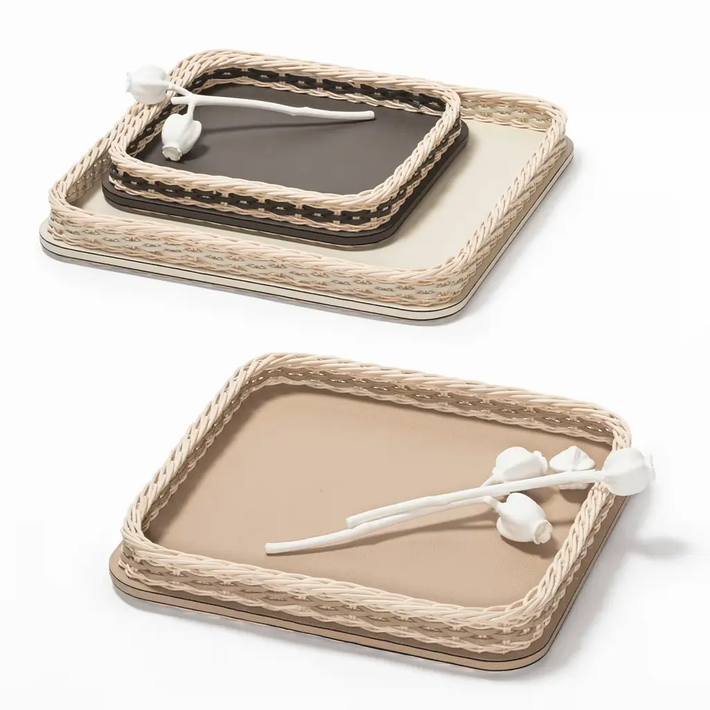 Leather-covered wood structure featuring a woven leather and rattan frame.