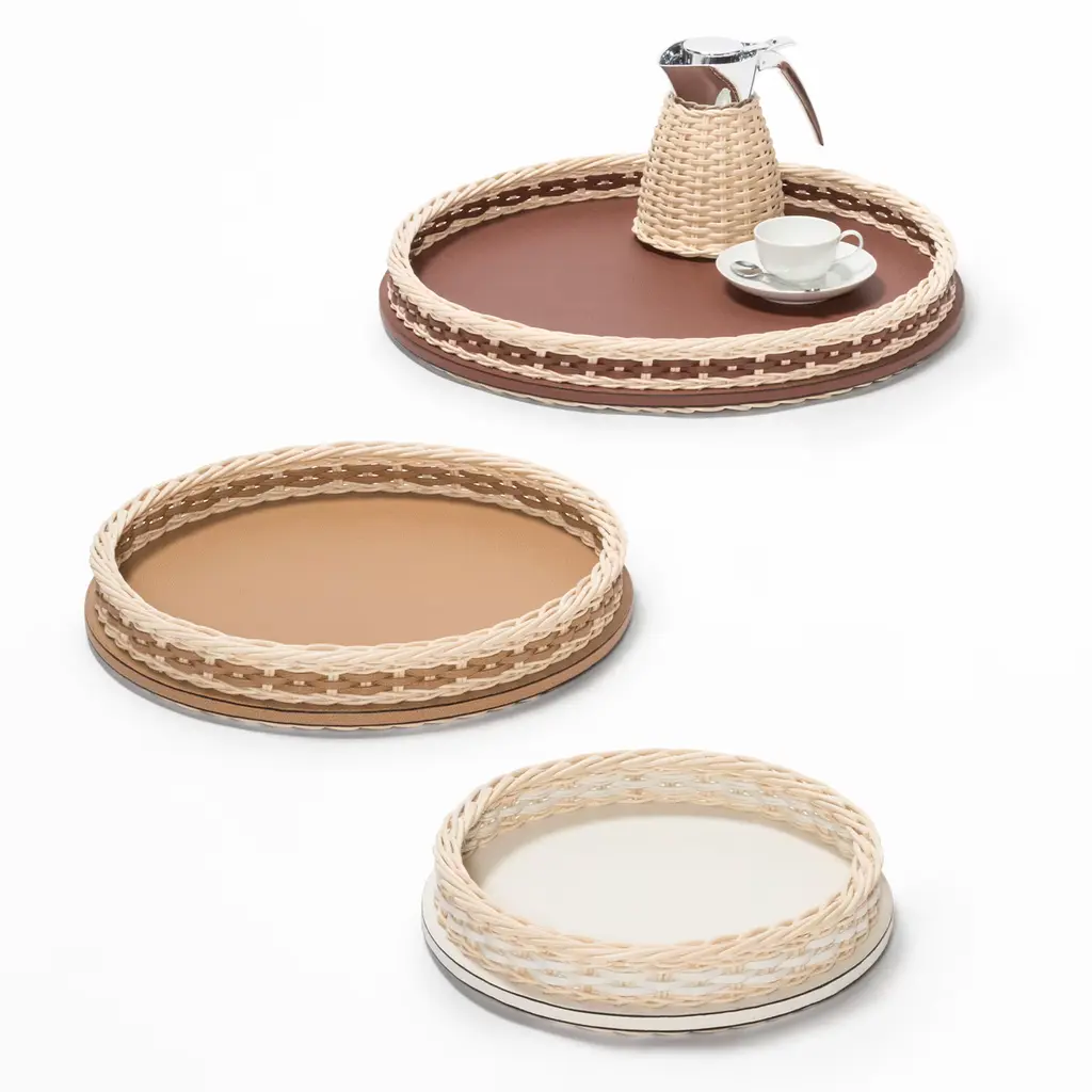 Leather-covered wood structure featuring a woven leather and rattan frame.