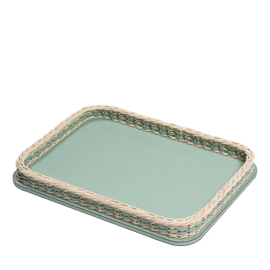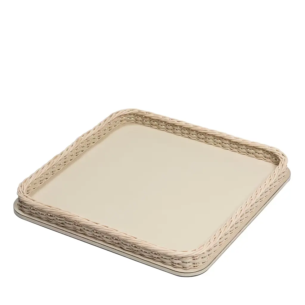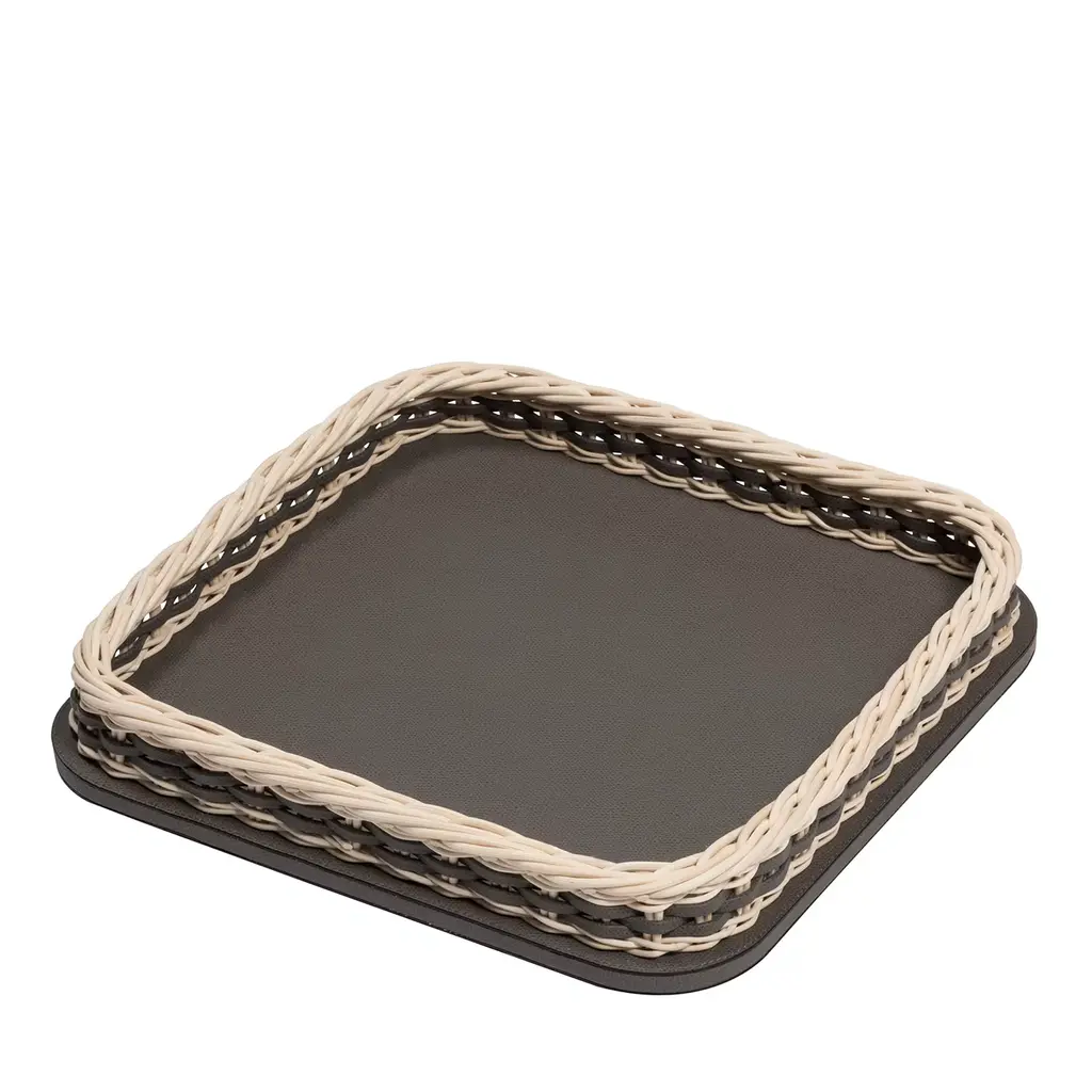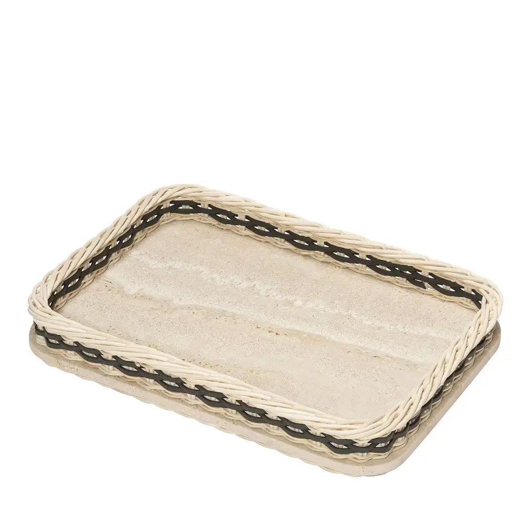 Travertine structure featuring a woven leather and rattan frame. Only available with natural rattan and travertine combined with golf or nappa leather.