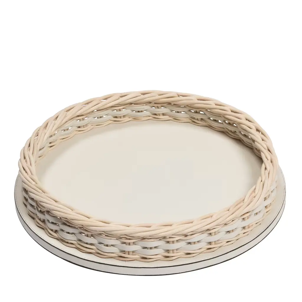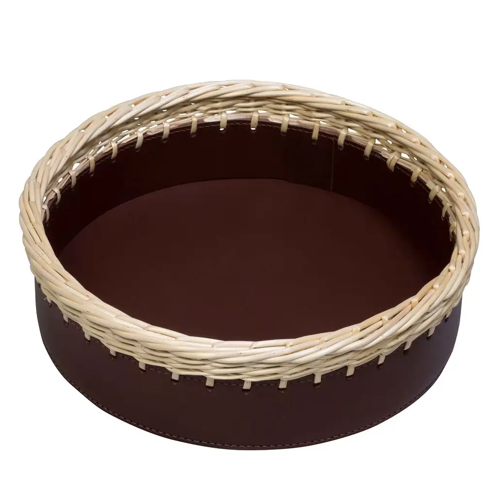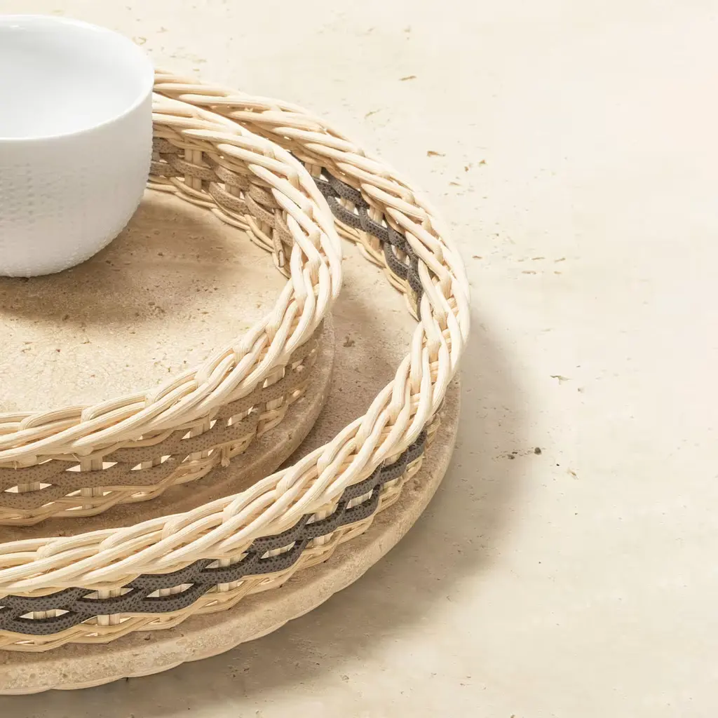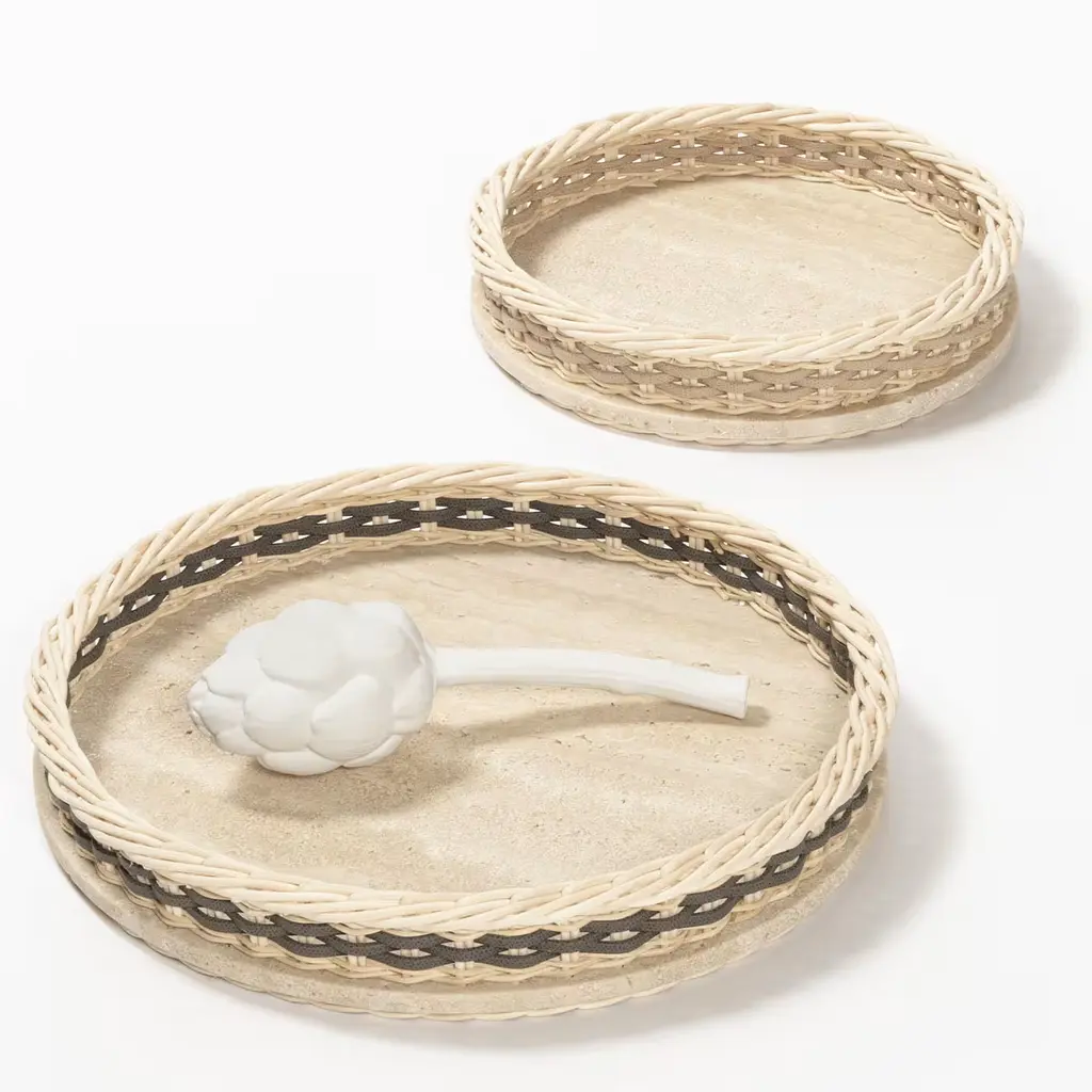 Travertine structure featuring a woven leather and rattan frame. Only available with natural rattan and travertine combined with golf or nappa leather.