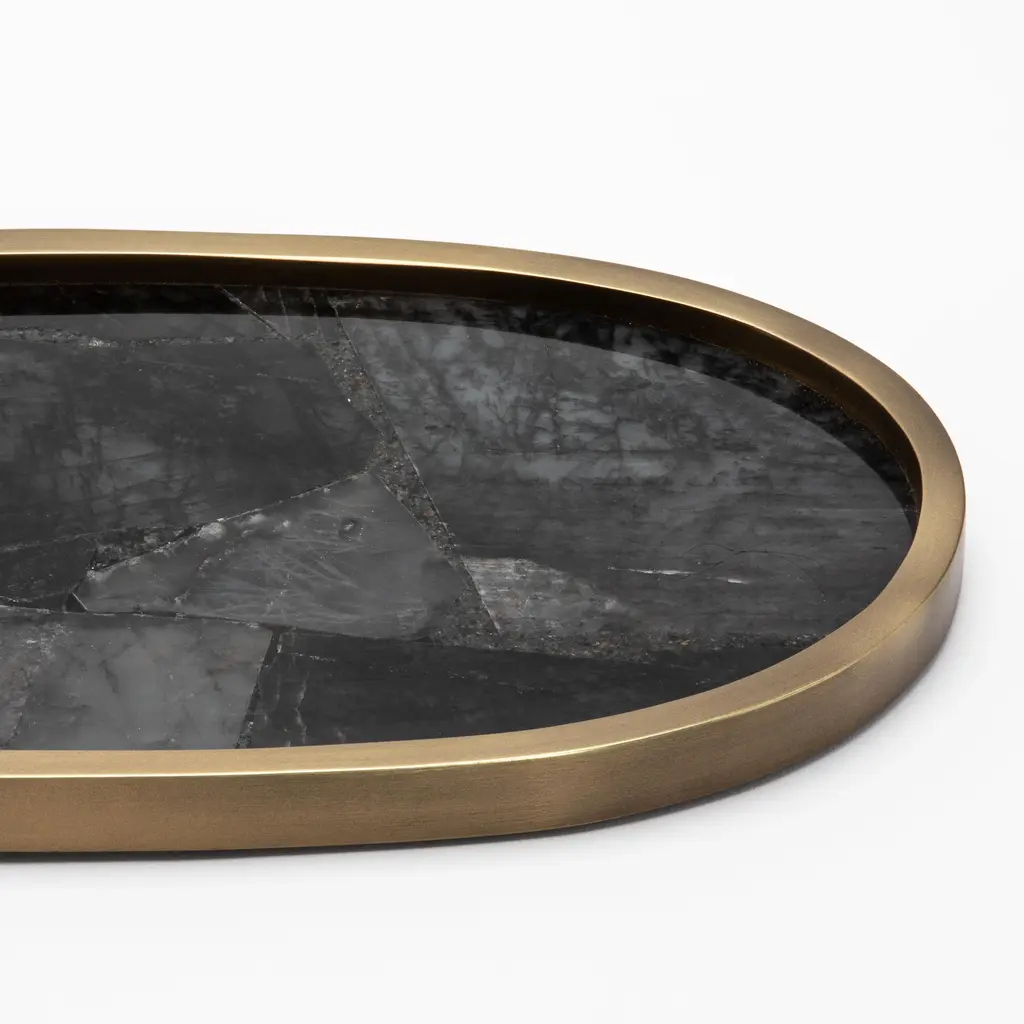 The Kifu Paris Oval Tray in black quartz is an opulent blend of sleek design and natural allure. Handcrafted with precision, this tray features a rich, deep black quartz surface that captivates with its multifaceted texture and inherent beauty. The stone's dark, moody tones are enhanced by subtle, shimmering veins that add depth and complexity. Framed in a warm bronze patina brass, the tray's modern yet timeless silhouette is strikingly elegant. The refined contrast between the luminous black quartz and the aged brass creates a piece that is both visually dynamic and exceptionally sophisticated, ideal for accentuating any luxury setting with a touch of understated glamour. Available in other finishes and shapes.