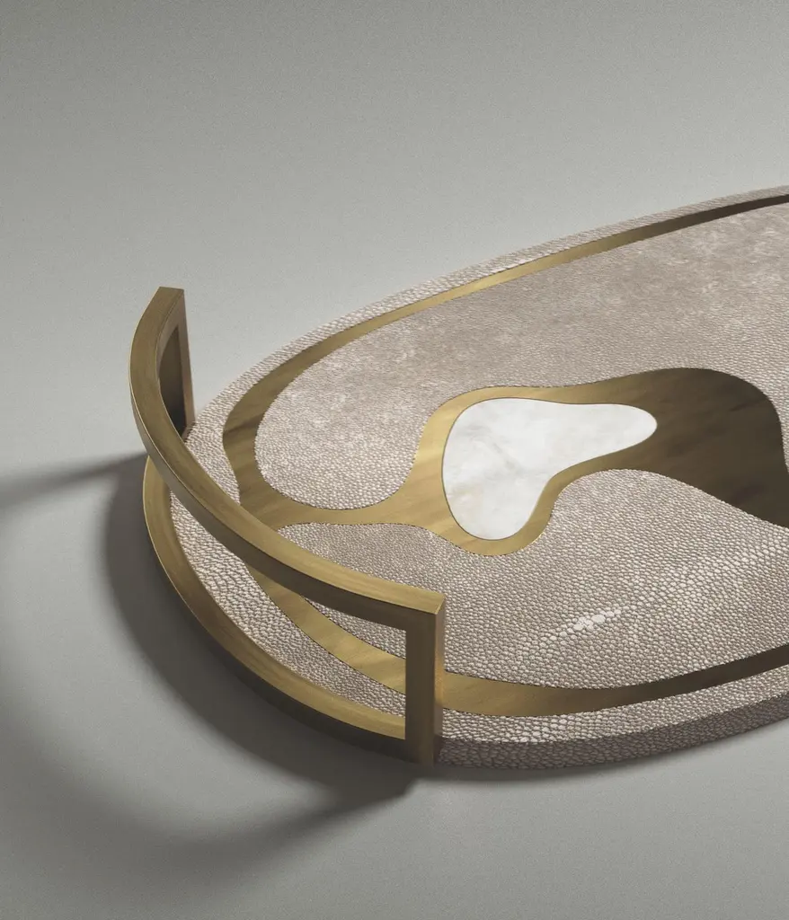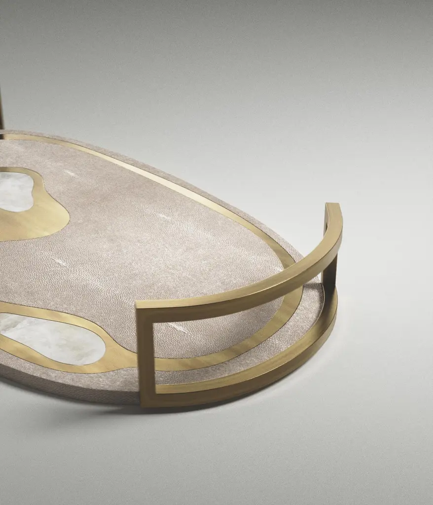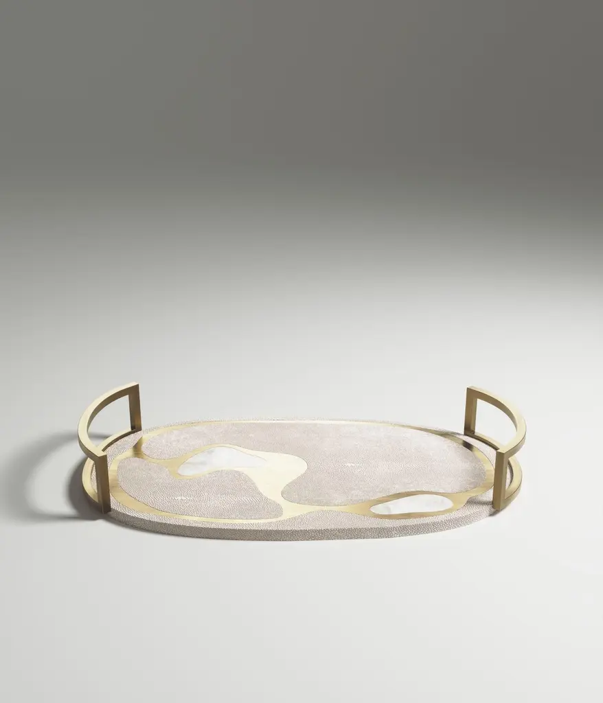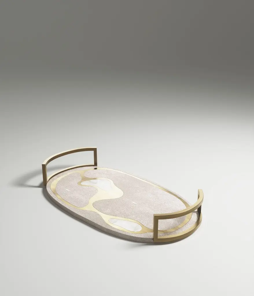The Paris based label has distinguished themselves since their launch, with their iconic use of shagreen mixed with brass and other exotic materials. All furniture is handcrafted by skilled artisans, ultimately making each piece unique, designed in Paris and produced in the Philippines.The Mask Oval Tray by Kifu Paris is a versatile and organic piece. The amorphous top and base are inlaid in a mixture of cream shagreen, white quartz and bronze-patina brass. This piece is designed by Kifu Augousti the daughter of Ria and Yiouri Augousti. All Kifu Paris pieces are handmade by artisans, ultimately making each piece unique.Wipe clean with soft dry cloth.Although inspired by her parents, her collection of Home Accessories and Furniture is a distinct identity of its own. Kifu uses handmade techniques of elaborate inlay patterns of shagreen, shells, semi-precious stones, materials she experienced as a child growing up in her parent’s studio, but interpreted in a younger quirkier way reflecting her youth. From her "jewelry inspired knobs" on decorative boxes, gold bar boxes and an extravagant inlay pattern mix of shagreen and shell inspired by galactic constellations, as seen on her enormous round mirror, is refreshing to see. Kifu embodies whimsical elements throughout her collection and is not afraid to be daring and unexpected in her approach to design. All shagreen-covered items should be kept out of direct sunlight, color variants may occur on the stingray and other exotic finishes, but this showcases the Parisian label's commitment to creating authentic luxurious products using natural components.
