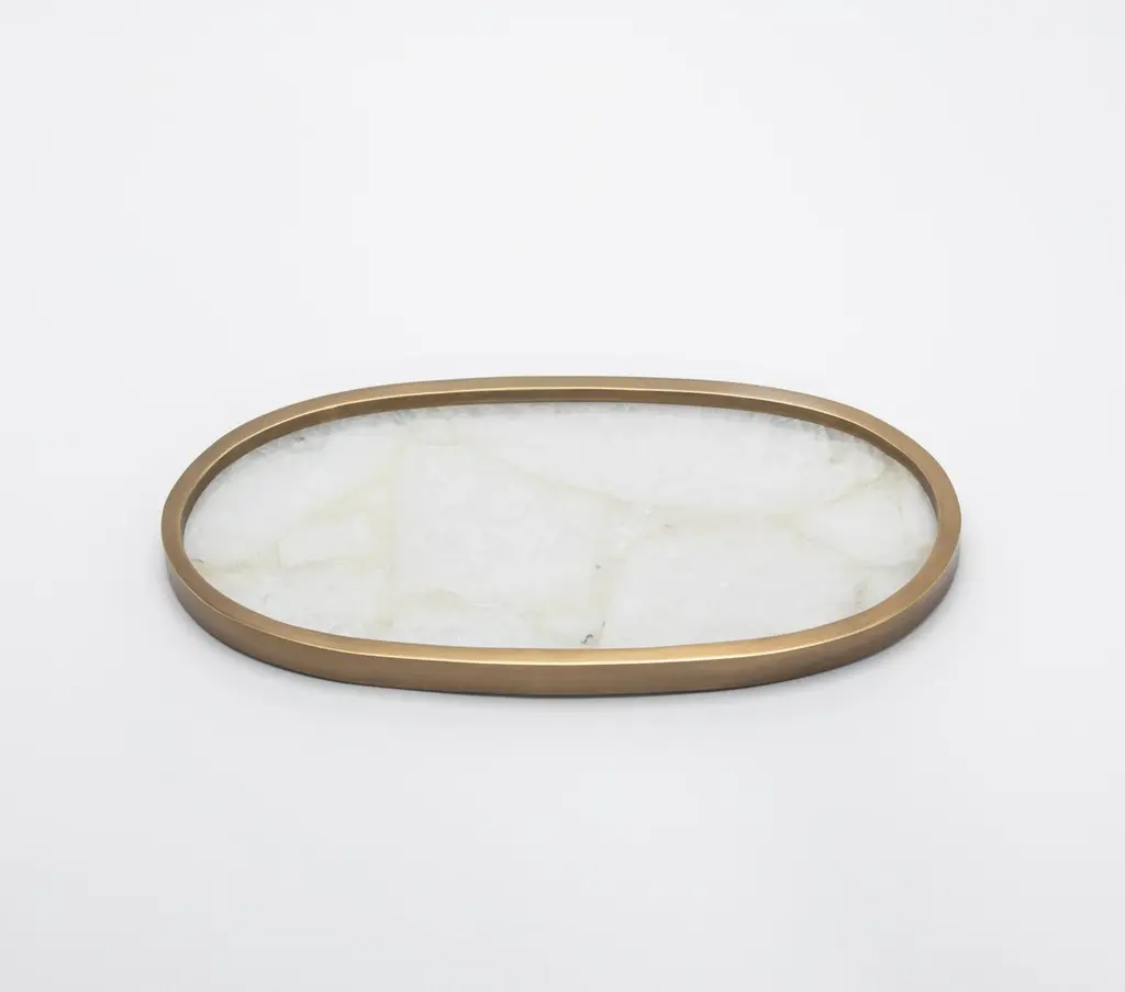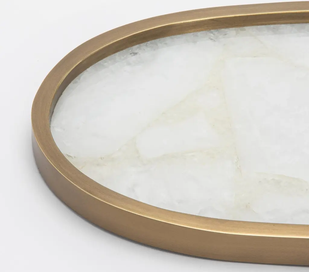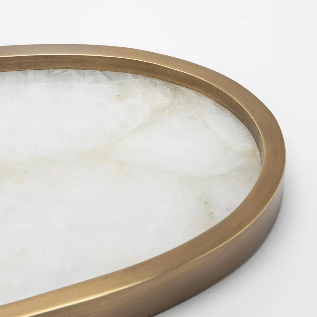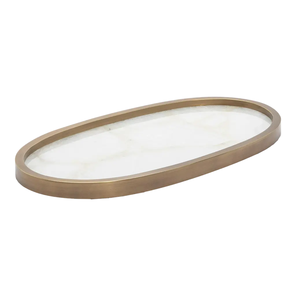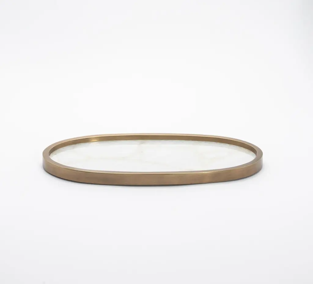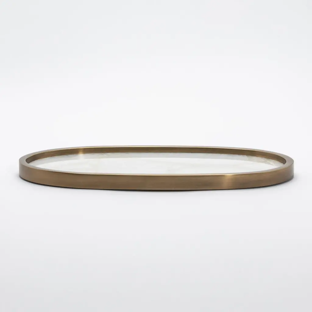 The Kifu Paris Oval Tray is a masterpiece of luxurious craftsmanship, merging natural elegance with refined artistry. The tray's surface is crafted from pristine white quartz, with intricate veining that captures the eye and reflects light in a soft, ethereal way, giving each piece a unique character. Encased in a smooth bronze patina brass frame, the oval silhouette enhances its understated sophistication. The combination of the delicate quartz and the warm, earthy tones of the bronze patina brass results in a balanced contrast, exuding a sense of both opulence and harmony. Each tray is meticulously handcrafted, ensuring a flawless finish that highlights the natural beauty of the materials. This exquisite tray is more than just a functional piece—it is a statement of timeless luxury, ideal for elevating any surface it graces.Available in other finishes and shapes.This item is on display in our LA showroomKeep away from direct sunlightColor variants may occur on the stingray and other exotic finishesClean with soft dry clothAbout KIFU PARIS:Kifu Augousti is an up-and-coming creator of modern furnishings, celebrated for her ability to blend the timeless elegance of the Art Deco tradition with a bold, contemporary flair. The daughter of renowned designers Ria and Yiouri Augousti, known as R&Y Augousti, Kifu has inherited a rich legacy while carving out her own distinctive style. Offbeat materials, sinuous curves, and wild patterns have become the hallmarks of her designs, cultivated from her early years in Paris to her current creative haven in Manila.Each piece in Kifu’s collection, whether furniture or accessories, is meticulously handcrafted by the finest artisans in the Philippines. These artisans, known for their unparalleled expertise, use only the best natural materials and apply intricate, hand-painted techniques, ensuring every item is a masterpiece. Available in exclusive showrooms in Paris, New York, and Los Angeles at the Pacific Design Center's MOGUL, her creations—ranging from sculptural benches with commanding bronze frames to exquisitely detailed boxes, trays and vases—are not just furnishings, but timeless treasures that represent the pinnacle of luxury and innovative design.