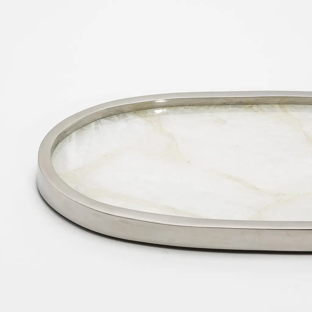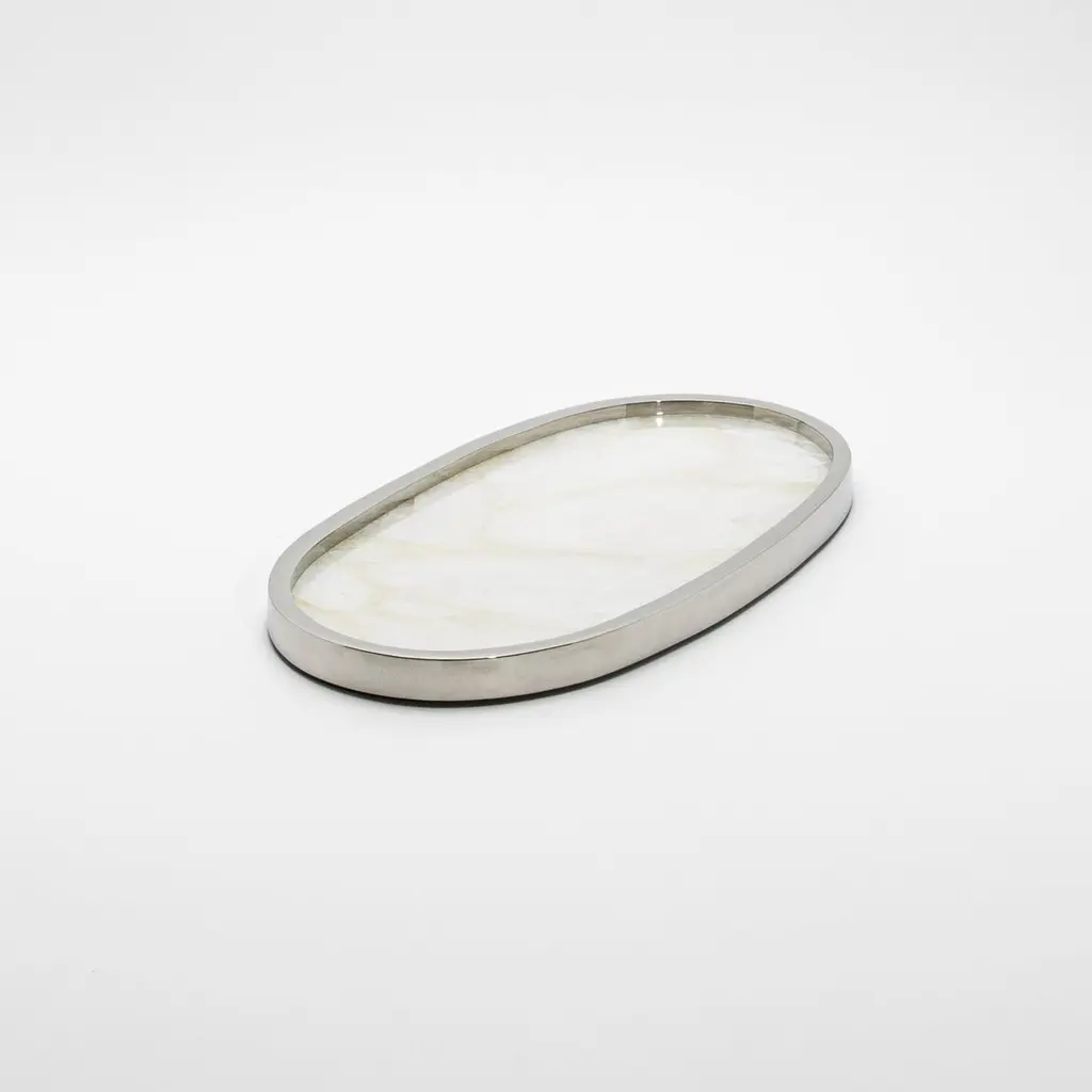 The Kifu Paris Oval Tray in white quartz with polished stainless steel brings an air of refined sophistication to any setting. The hand-crafted white quartz surface boasts a smooth, natural elegance with soft veining that highlights its organic beauty. Framed by a gleaming polished stainless steel border, the tray catches the light, creating a striking contrast between the cool stone and the reflective metallic frame. This luxurious combination of materials and expert craftsmanship makes it a perfect statement piece, whether used for serving or as a decorative accent, adding a touch of modern opulence to any space.Available in other finishes and shapes.This item is on display in our LA showroomKeep away from direct sunlightColor variants may occur on the stingray and other exotic finishesClean with soft dry clothAbout KIFU PARIS:Kifu Augousti is an up-and-coming creator of modern furnishings, celebrated for her ability to blend the timeless elegance of the Art Deco tradition with a bold, contemporary flair. The daughter of renowned designers Ria and Yiouri Augousti, known as R&Y Augousti, Kifu has inherited a rich legacy while carving out her own distinctive style. Offbeat materials, sinuous curves, and wild patterns have become the hallmarks of her designs, cultivated from her early years in Paris to her current creative haven in Manila.Each piece in Kifu’s collection, whether furniture or accessories, is meticulously handcrafted by the finest artisans in the Philippines. These artisans, known for their unparalleled expertise, use only the best natural materials and apply intricate, hand-painted techniques, ensuring every item is a masterpiece. Available in exclusive showrooms in Paris, New York, and Los Angeles at the Pacific Design Center's MOGUL, her creations—ranging from sculptural benches with commanding bronze frames to exquisitely detailed boxes, trays and vases—are not just furnishings, but timeless treasures that represent the pinnacle of luxury and innovative design.