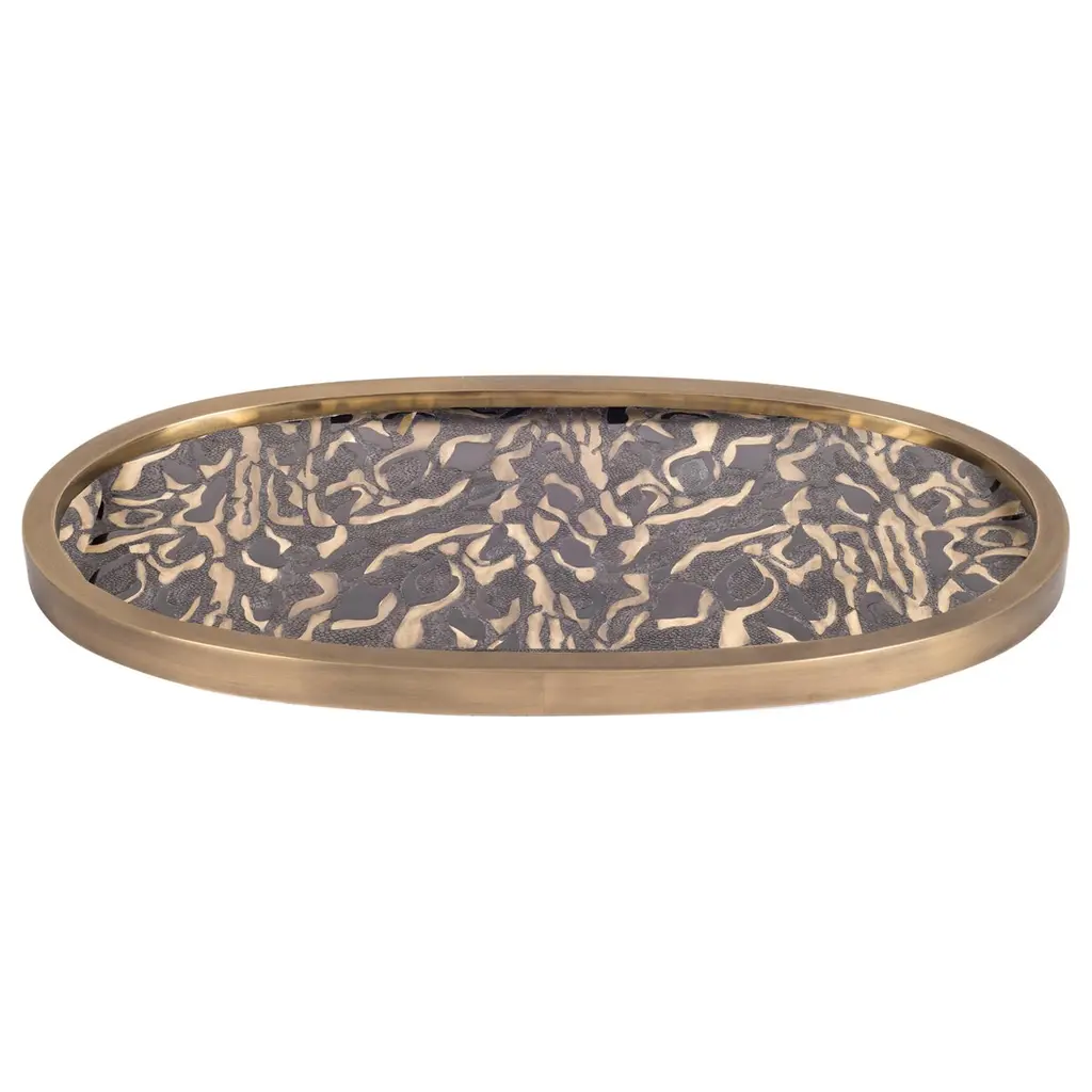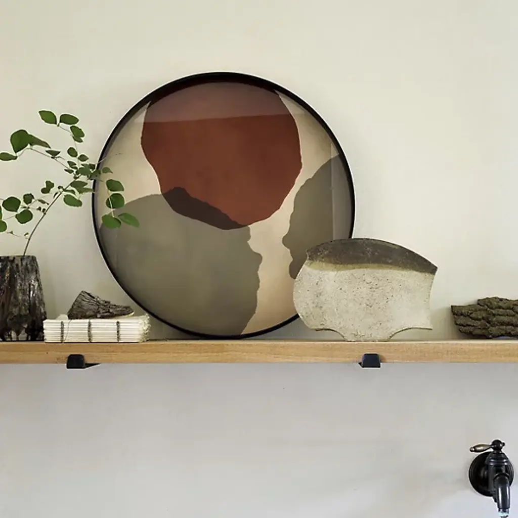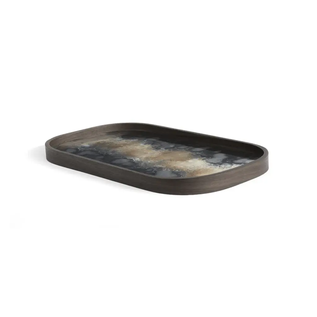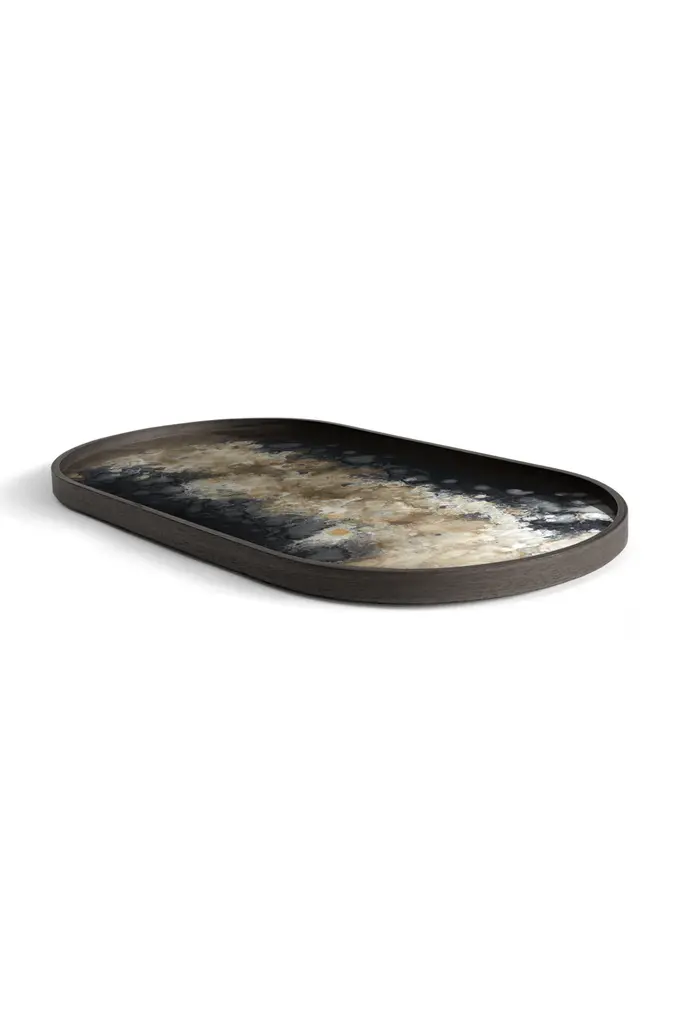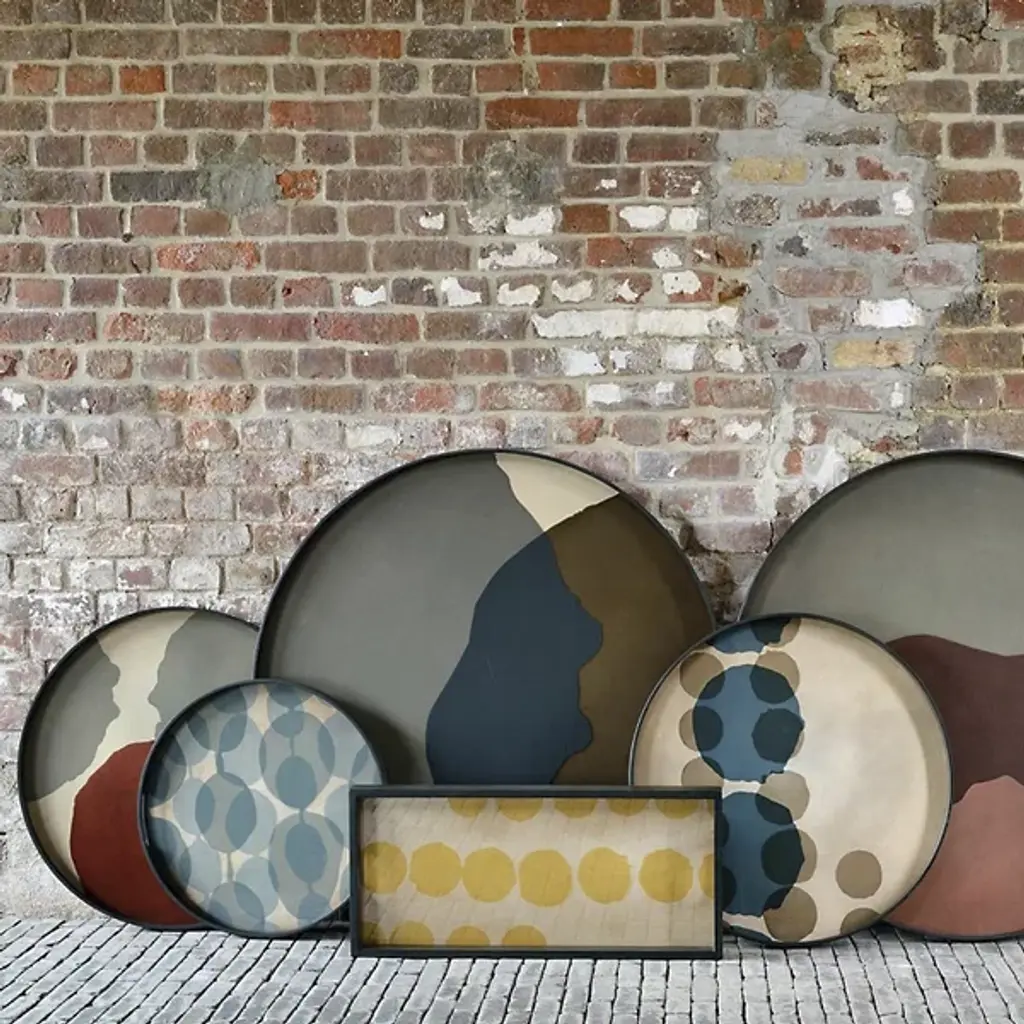 Dynamic dot combinations blossom atop the Overlapping Dot Tray from Ethnicraft, designed by Dawn Sweitzer. Organic dots artfully layer over inside a ring frame of slender wood, conveying a bold yet delicate sense of depth. The tray mixes organic pigments and inks for a light, contemporary dot motif with retro appeal.