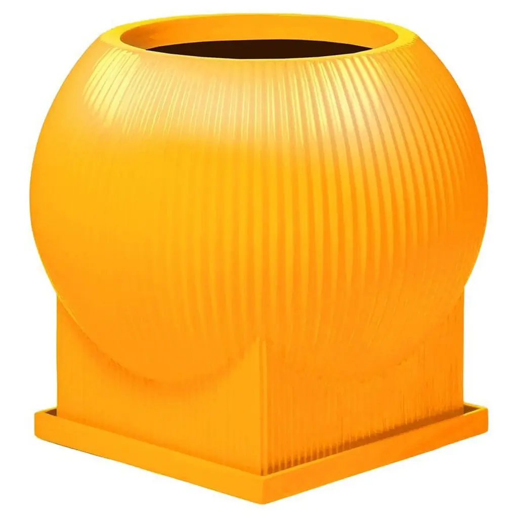Oversize Flat Blob PlanterFiberglassDiameter at opening: 23"Diameter full width: 34"Height: 34"Base: 24" x 24" (not including tray)The oversize flat Blob is the largest in the TFM collection. This style is spherical in shape with fluted fiberglass detail. All designs are handcrafted in Mexico and suitable for both indoor/outdoor use. Each planter contains drainage and comes with a matching fiberglass drainage tray. The collection comes in five colors and custom colors are available upon request.Lead time for this item is 8-12 weeks.