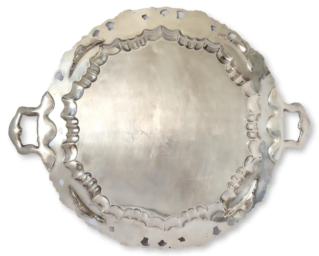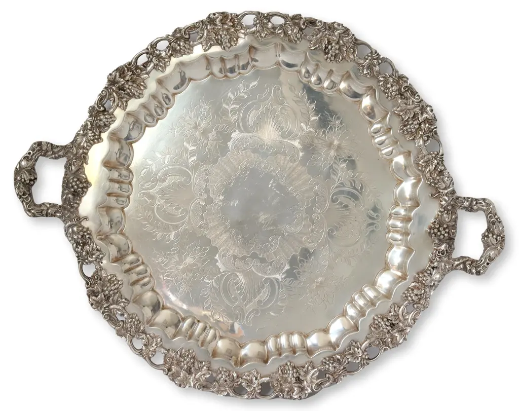Large silver-plated tray with grapevine pattern. Heavily detailed, best quality. Impressed stamp on underside.
