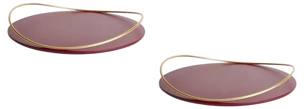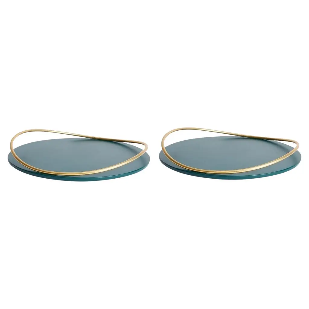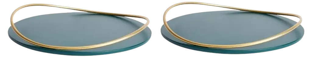 Pair of petrol green touché b tray by Mason EditionsDimensions: 36 × 47 × 6.7 cmMaterials: Iron and MDFColours: taupe, cotto, burgundy, sage green, petrol greenA light metal rod that rests on the surface and then lifts up, almost touching the surface with a quick tap, a movement that defines the handles of Touché trays.The organic shape of the round base communicates with the thin tubular, giving the impression of a perpetual undulatory motion, which seems to vanish when the trays are looked at from above.This small round tray with an oval handle won’t go unnoticed in the eyes of your party and dinner guests.The round MDF base is available in several colours, with a slim handle in galvanized 24k gold. A versatile design object used to serve food and drinks as well as display jewellery and bedroom vanity.Mason Editions is an Italian company specialized in the production of design furniture, lighting solutions, and accent pieces. Born from the lifelong passion for lighting and entrepreneurial spirit of Fabio and his partner Silvia, Mason Editions places itself halfway between fine art and exquisite craftsmanship. A collection of lighting, design objects, and furnishing accessories, signed by artists Serena Confalonieri, Martina Bartoli, and Matteo Fiorini, head of the creative direction.Mason Editions comes from the experience of an Italian lighting company placed in the Veneto region.This new brand of furniture elements was born from the meeting between the entrepreneur Fabio Mason and three international designers who designed the first collection for a sophisticated public. Therefore the collection wants to be eclectic and timeless.The material contrast and fresh design, with essential shapes, mark the mason editions collection.In conclusion, the elegant Italian sign highlights proposals suitable for all environments.Mason editions is a set of experiences, artisans, and productive know-how that creates a capable system.