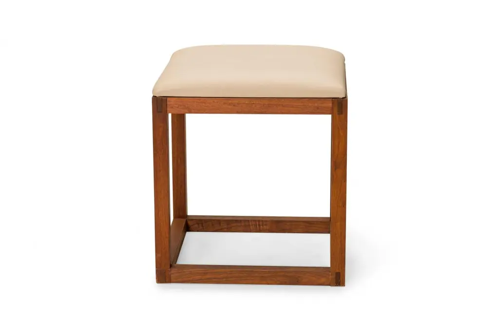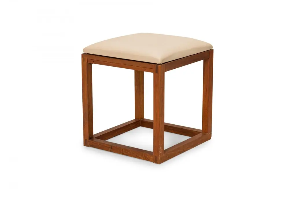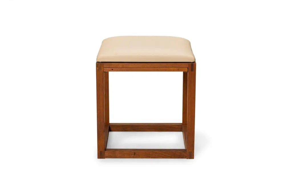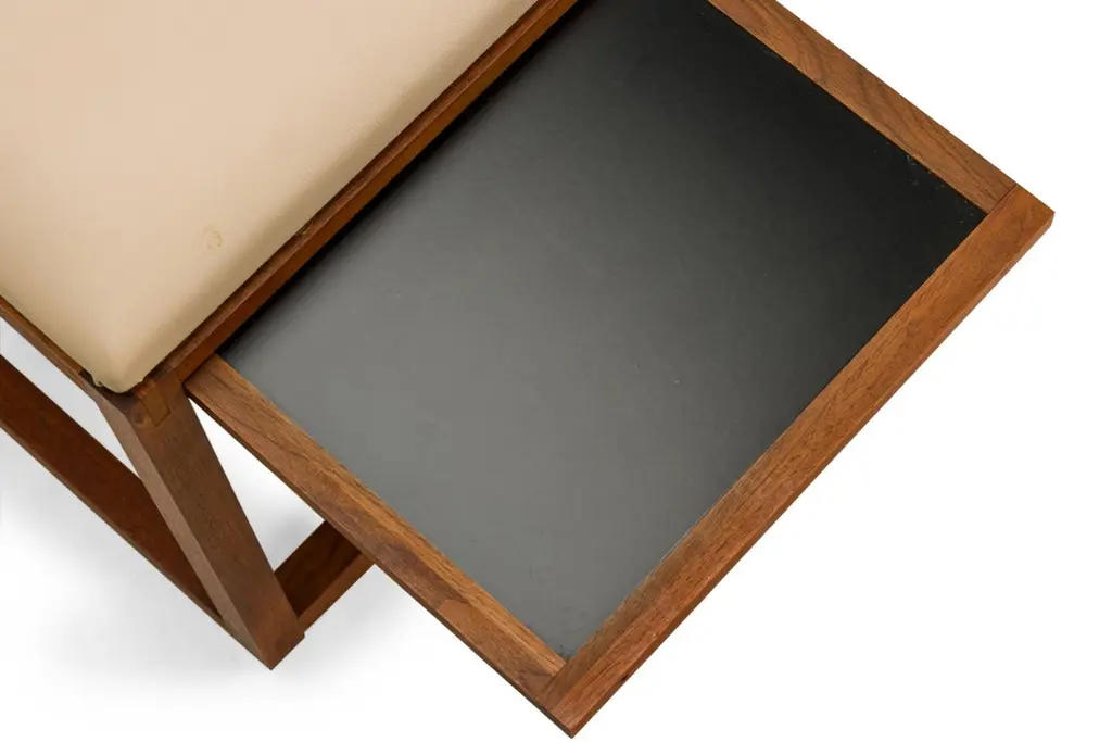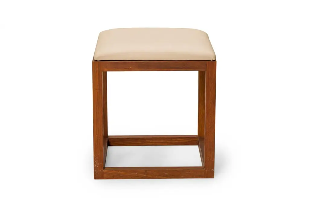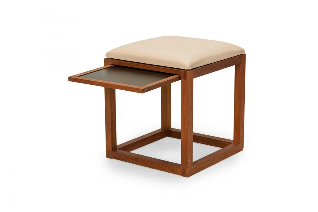 Pair of American mid-century stools with wooden cube frames concealing slide out trays beneath gray leather upholstered seats. (TONY PAUL)(PRICED AS PAIR)