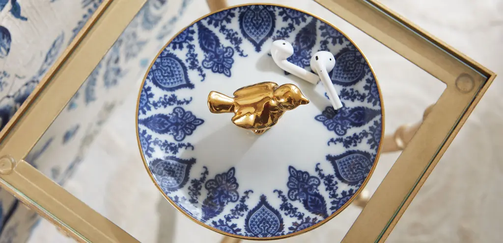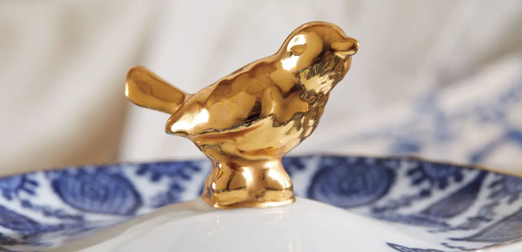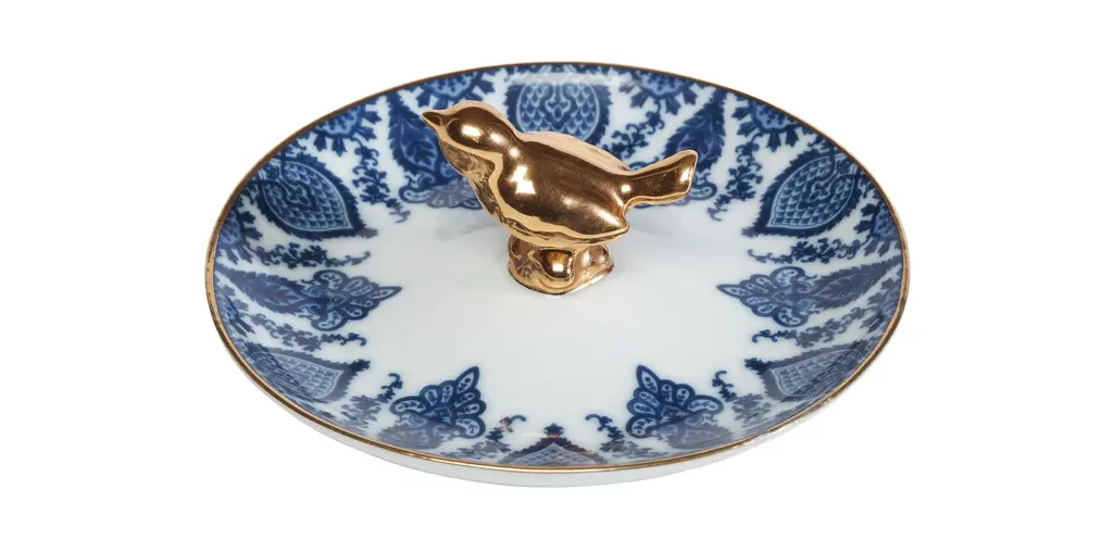 This adorable chinoiserie tray features a charming gold-tone bird who's happy to keep your small items safe. Crafted from porcelain with a traditional pattern in blue and white. Display it with our matching porcelain keep-all jars, Tulip and Arabesque.