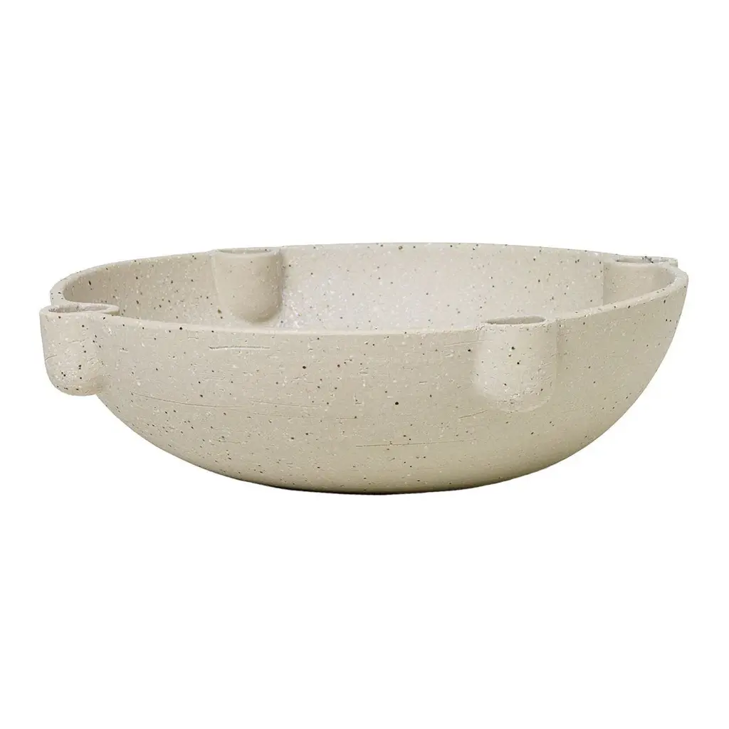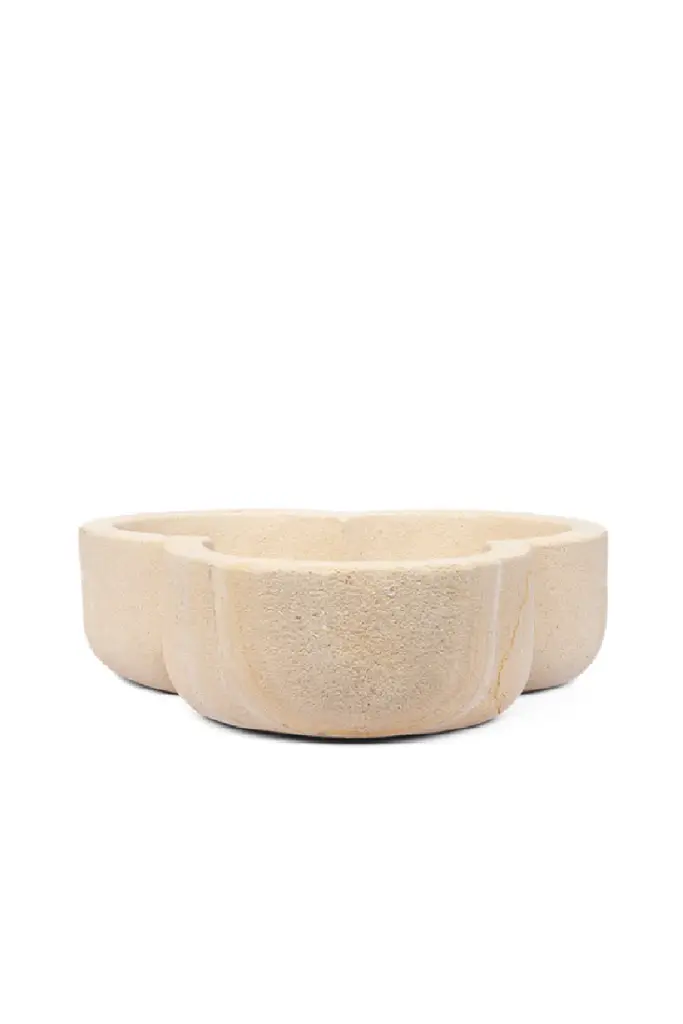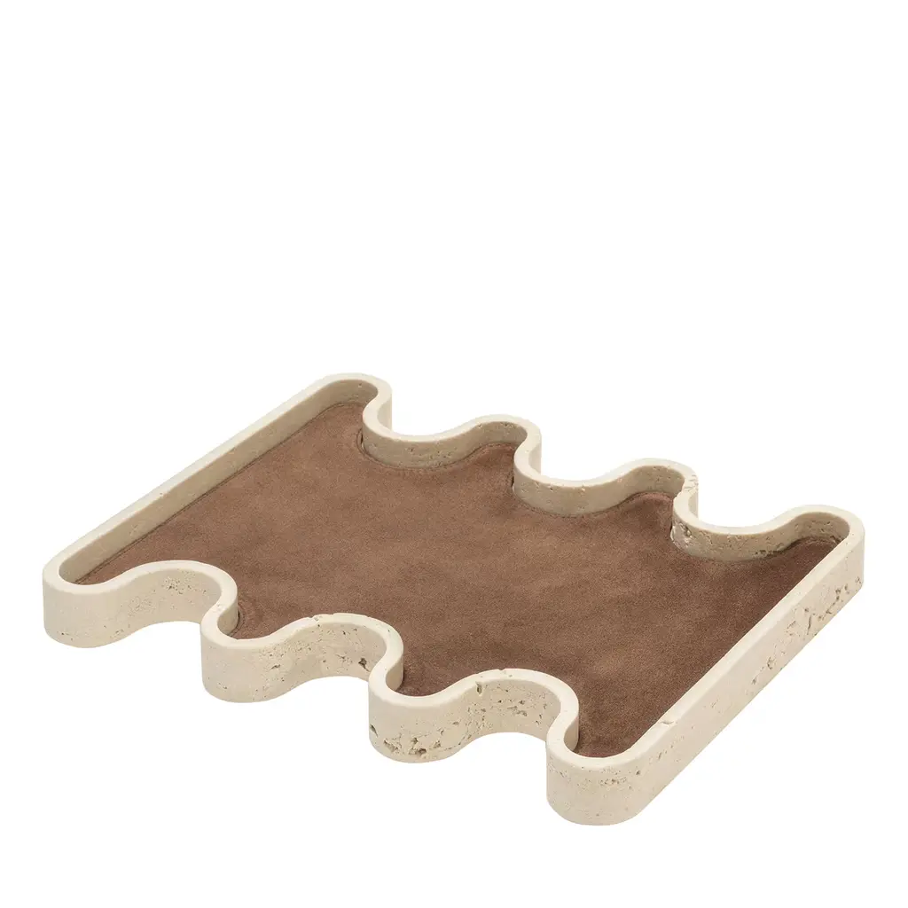 Expertly crafted in a distinctive figure-eight formation, the geometric frame of this refined valet tray is made entirely of cream-colored travertine limestone and lined in a delicate beige calfskin shearling. This harmonious combination of shapes and materials adds textural depth to the work. Sleek and modern, this valet tray is a versatile addition to an entryway or bedroom decor. Given alone or as a set with an item from the same collection, this piece will also make a unique gift for a loved one.