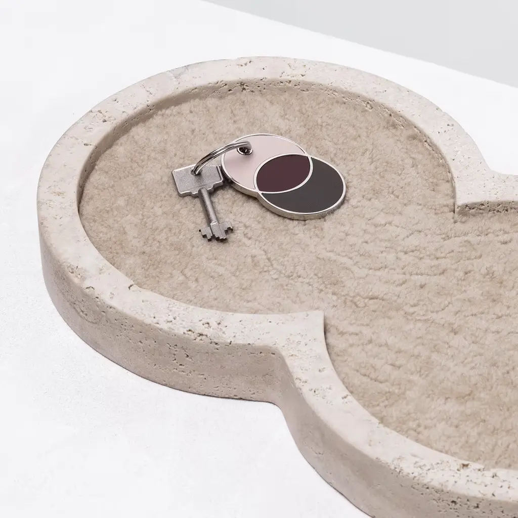 Expertly crafted in a distinctive figure-eight formation, the geometric frame of this refined valet tray is made entirely of cream-colored travertine limestone and lined in a delicate beige calfskin shearling. This harmonious combination of shapes and materials adds textural depth to the work. Sleek and modern, this valet tray is a versatile addition to an entryway or bedroom decor. Given alone or as a set with an item from the same collection, this piece will also make a unique gift for a loved one.