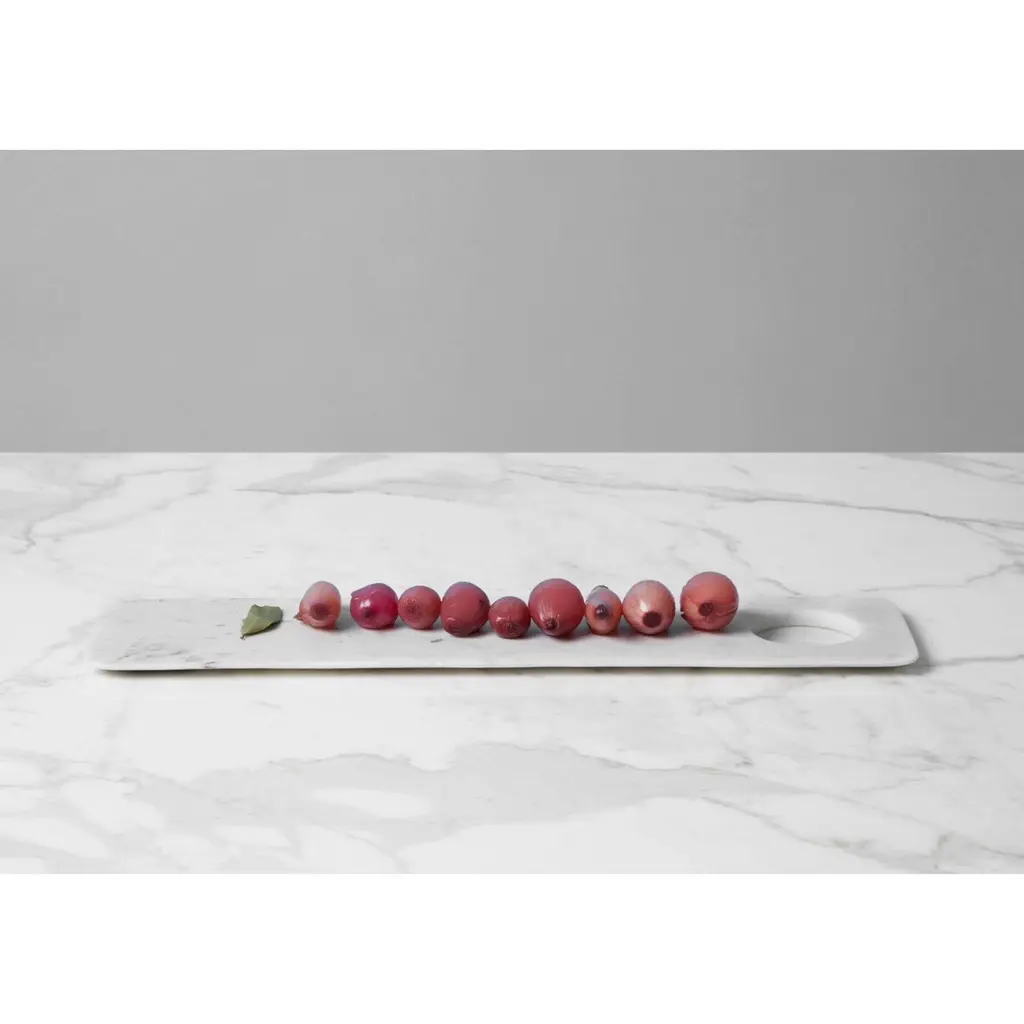 Paletta tray/chopping board by StudioformartTotal Marble CollectionDimensions: 50 x 12 x 1 cmMaterials: Bianco Carrara The history of marble carving is lost in time; in one breath, it takes us back to the IV century BC, to ancient Greece where decorations and sculptures were created from the shimmering stone. Andrea and Simone Dell’Amico, the souls of Studioformat, are young designers from Carrara who live and breathe marble in the nearby quarries, challenging the material’s strength. Total Marble is a collection that introduces curved and rectangular trays, place mats and mise en place that suggest fleetingness in a material, the divine aspects of which, have been transformed into objects for everyday use.Andrea and Simone Dell’Amico are the souls of Studioformart, an artistic studio “made in Carrara”, founded in 2003 and specializing in the design and processing of marble.Their collaborations with local and international craftsmen, artists, architects and designers are many. In addition to being teachers, the Province of Tuscany selected them to provide internships to Erasmus students from all over Europe. In 2006 and 2009 they won the D.A.B. (Design for Artshop and Bookshop) competition, participating in the exhibitions at the Galleria Civica in Modena, and Palazzo delle Esposizioni in Rome.