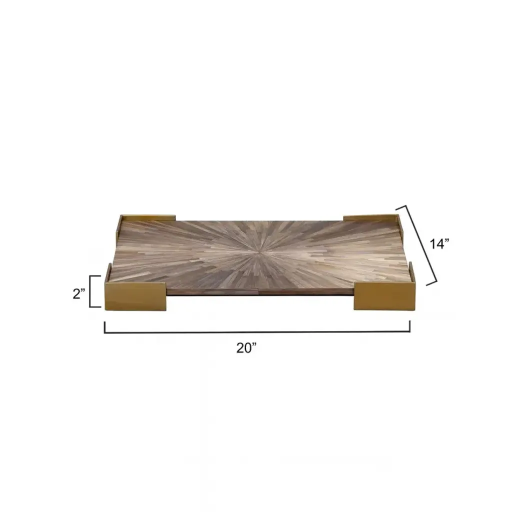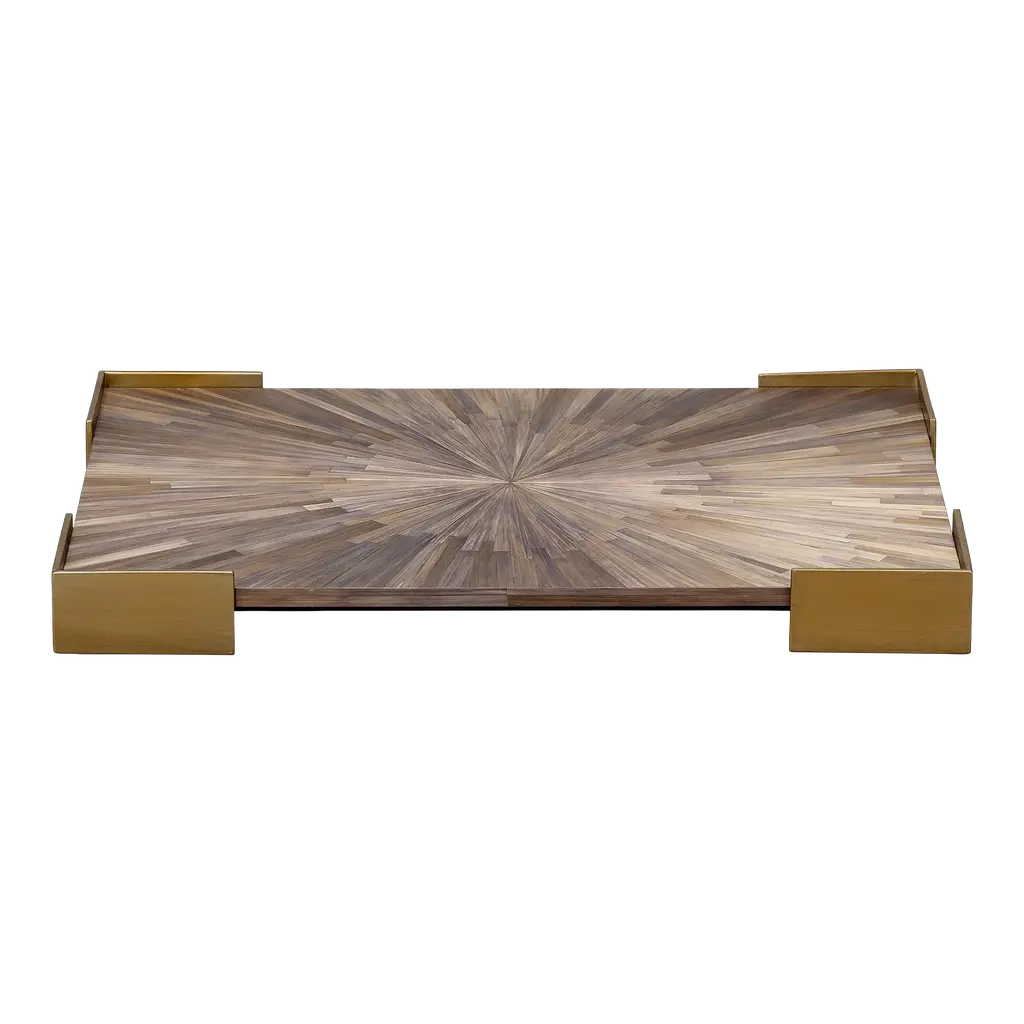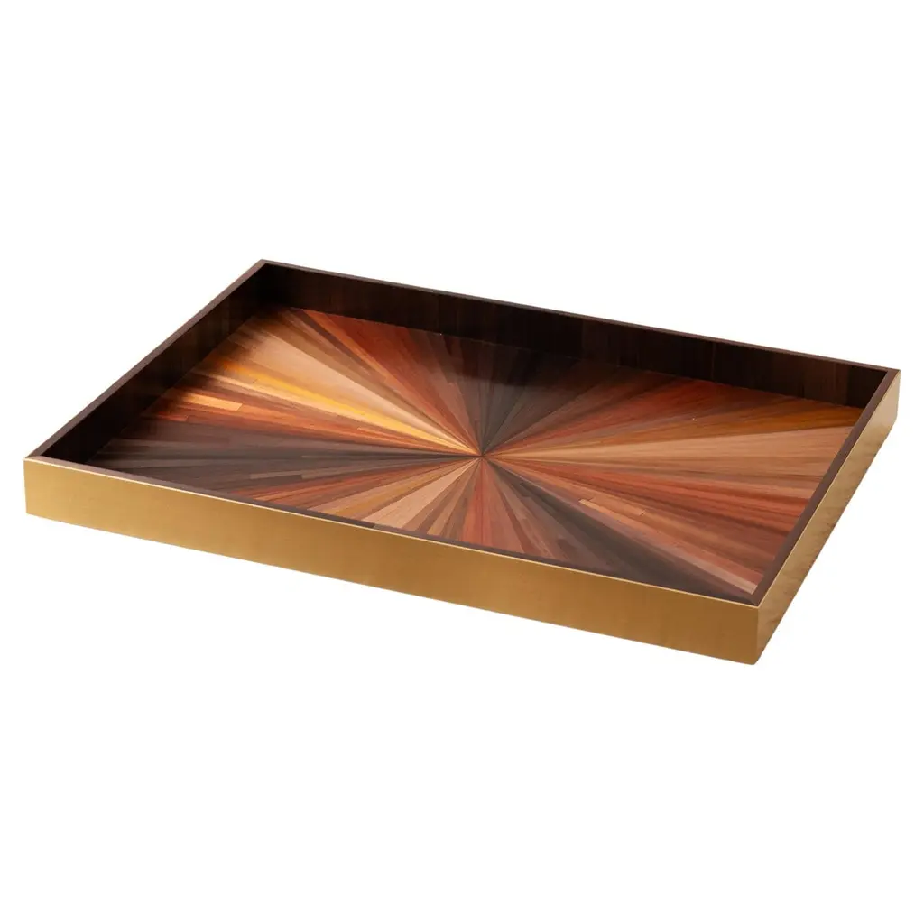 Artisans create the exuberant starbursts on these generously sized trays from thin strips of straw in variegated natural tones. Its legs are slim rectangles of iron that have been finished in gold and then carefully folded around its corners. Underneath is a brown suede lining. With its lux interpretation of mid-century design and its decidedly tropical aesthetic, this tray can be Topped with bottles of exotic liqueurs in a home bar, or filled with books and used on an ottoman or accent table.