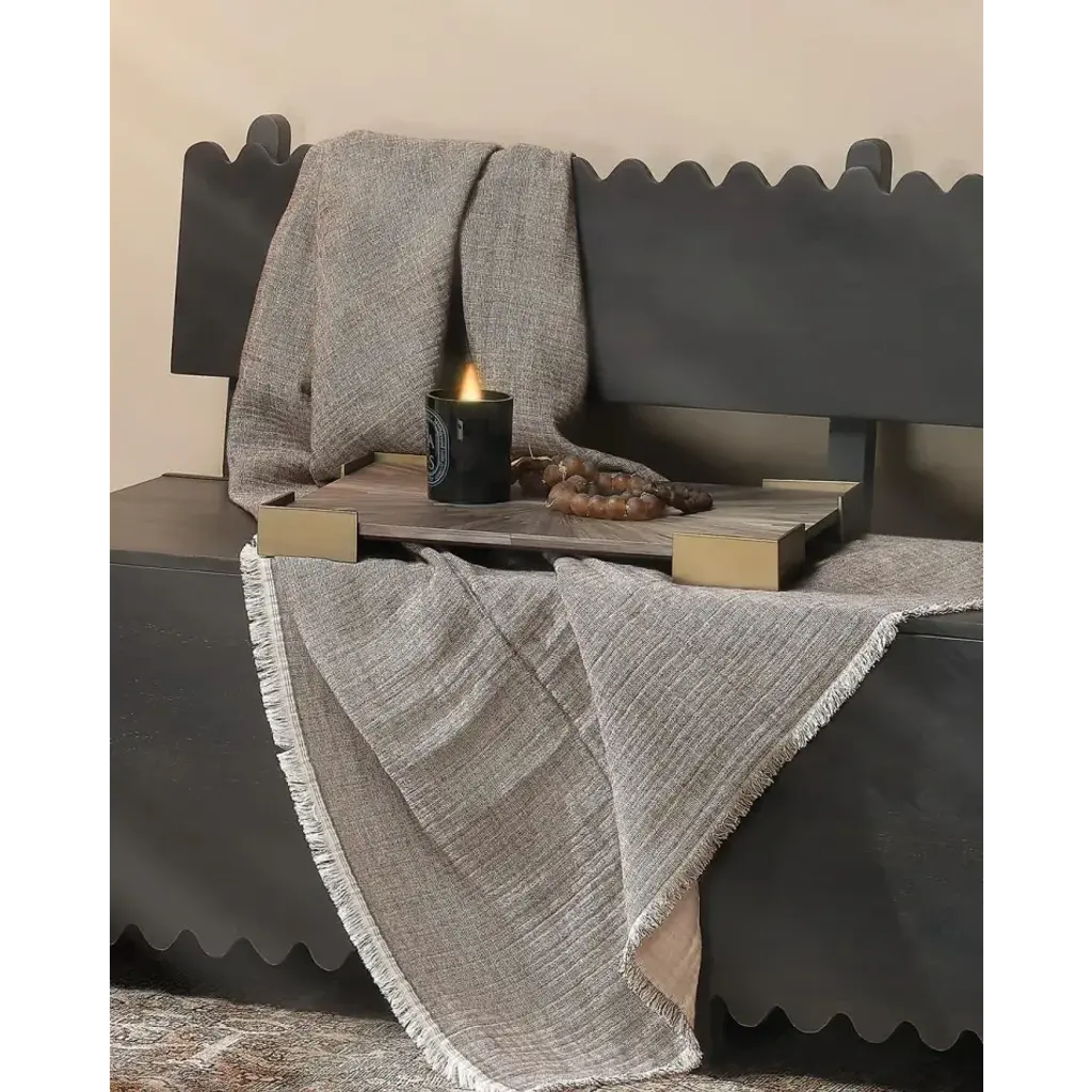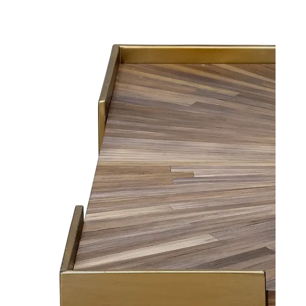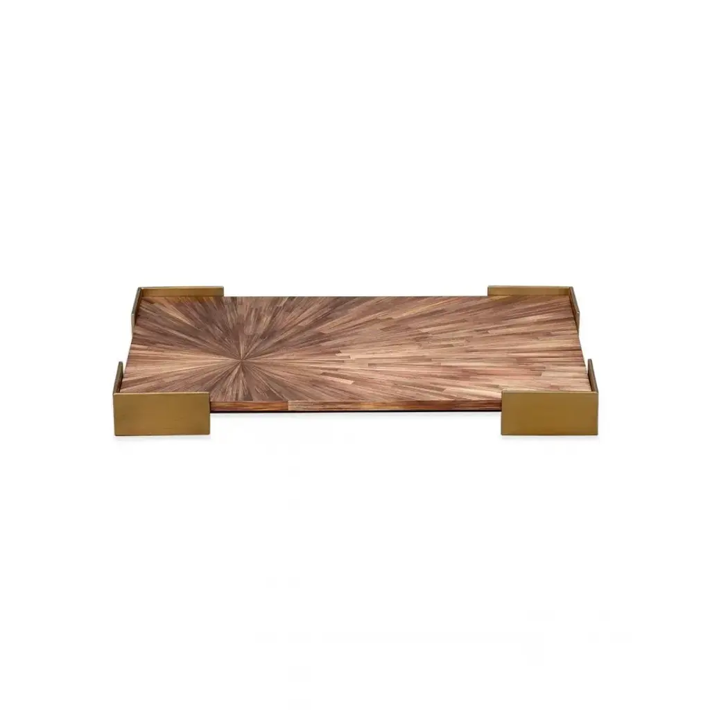 Artisans create the exuberant starbursts on these generously sized trays from thin strips of straw in variegated natural tones. Its legs are slim rectangles of iron that have been finished in gold and then carefully folded around its corners. Underneath is a brown suede lining. With its lux interpretation of mid-century design and its decidedly tropical aesthetic, this tray can be Topped with bottles of exotic liqueurs in a home bar, or filled with books and used on an ottoman or accent table.