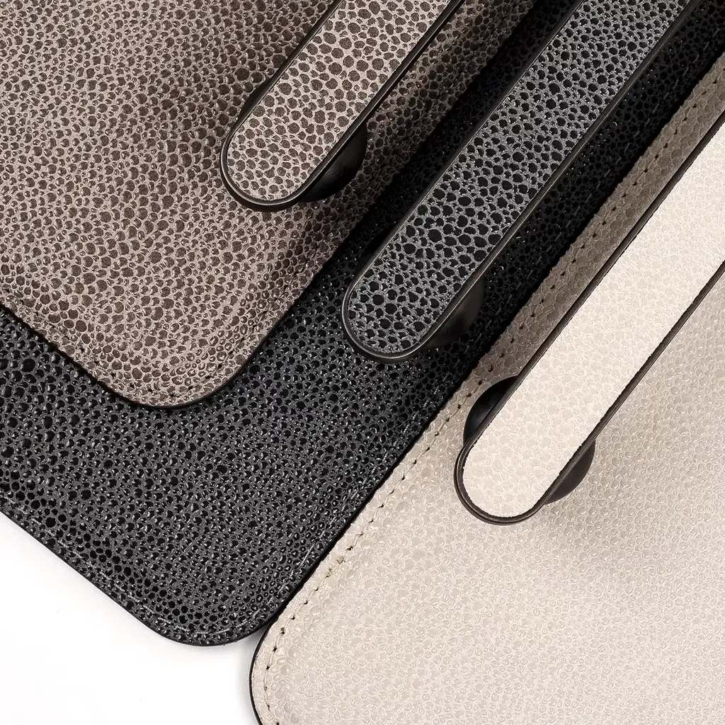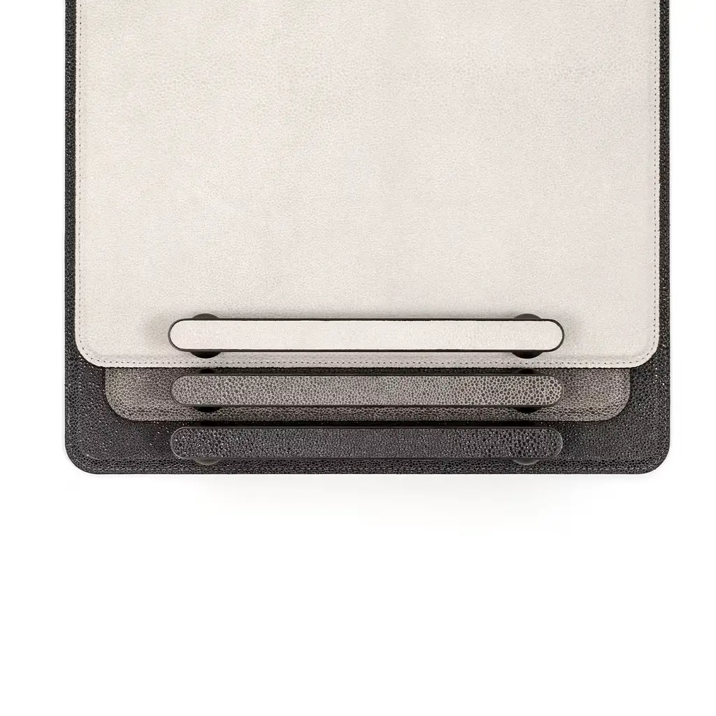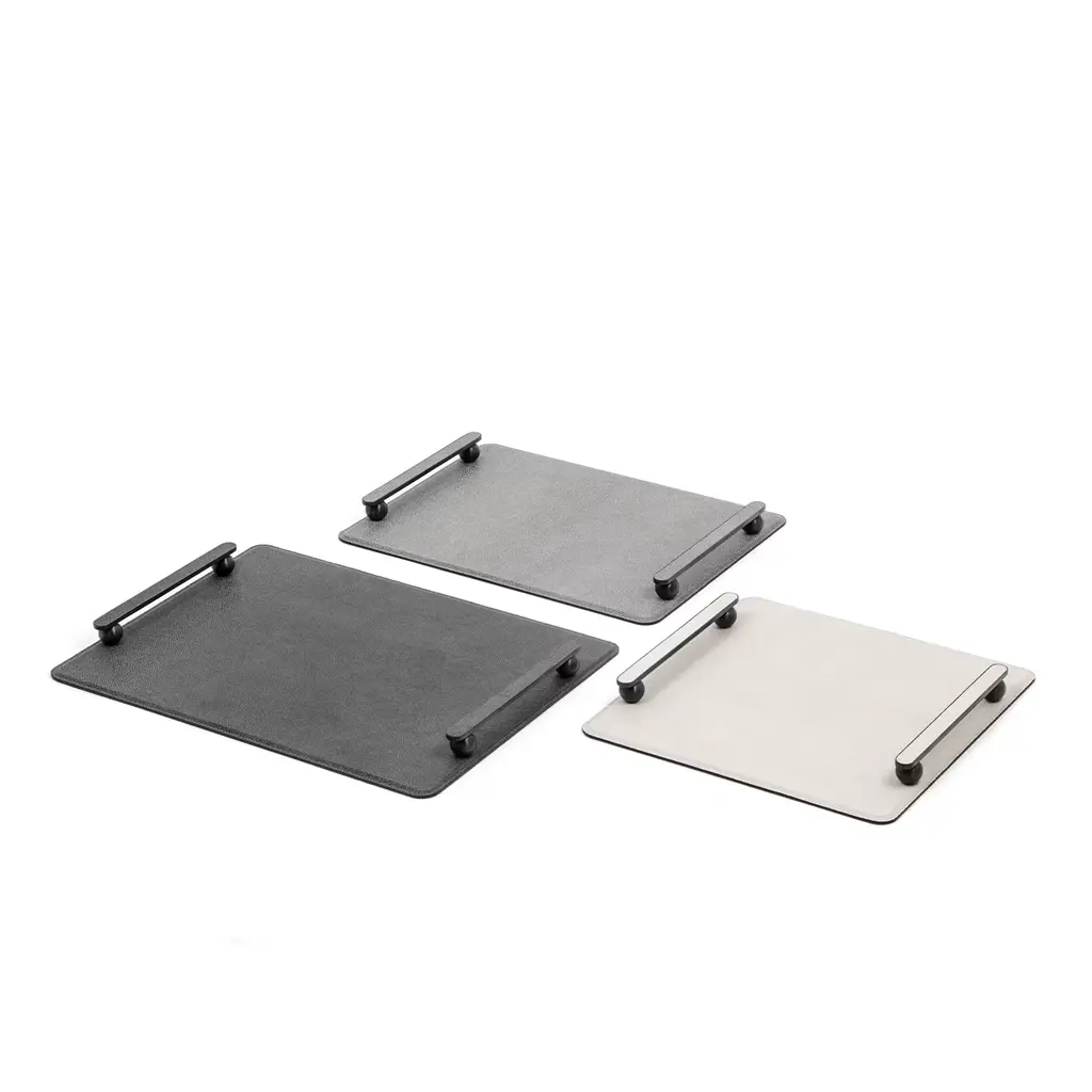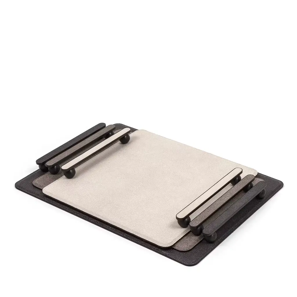 Clean geometric volumes softened by rounded accents define the exquisitely modern design of this tray. Revealing its luxe allure through its prized, beige leather cover, it offers a wide, rectangular base where to lay objects or serve drinks, equipped with handles comprised of spheres surmounted by elongated grips that also match their burnished finish. Glossy gold and chromed finishing options are available, please contact the Concierge for details.