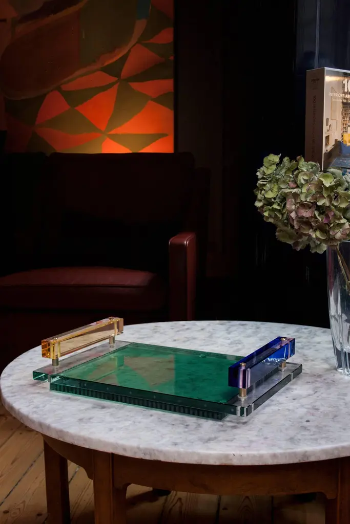 Panama crystal tray hand sculpted contemporary crystalDecorative trayHandcrafted decor made from crystalMeasures: L 40 x H 8.1 x D 2 6 cmHand sculpted in crystalPanama trayThe spirit of the Memphis style enters the mainstream - welcome to the Panama Tray by Reflections Copenhagen. The Panama Tray is Reflections Copenhagen reaction to structured straight lines of mid-century modern design, disregarded “good taste” in favour of the radical, funny, and outrageous.Reflections Copenhagen, a collection of handmade decorative mirrors and Crystal pieces, finely balanced to Challenge the traditional styles and shapes of todays’ homes by adding new dimensions and possibilities to interior decorating. Julie Hugau and Andrea Larsson, inspired by the graphic expression of Art Deco, the vast contrasts of the 1980s and the opportunity to explore the delicate materials that the mirrors are made of, combined their visions and the start of Reflections was a fact. The collection sums up their perspectives of how to provide new expressions through strength and form, the mirrors are designed with a strong visual structure to create a contrast of light and reflections through non-traditional mirror images. A concept built on Julie’s flair for design and production, Andrea’s eye for interior and colours together with their shared vision of creating a product that unites art and decor. Remember, everything in your life is a reflection of a choice you made. If you want a different result, make a different choice welcome to the world of reflections.The beauty of craftsmanshipAll reflections Copenhagen products have been individually hand produced with unique artisan techniques. All the irregularities and inconsistencies that you may find are part of its unique handcrafted character and beauty.“We feel very privileged to be able to do exactly what we want to and to work with each other; the exchange of energy and creative ideas is constant and what drives the brand forward”Julie Hugau & Andrea Larsson.