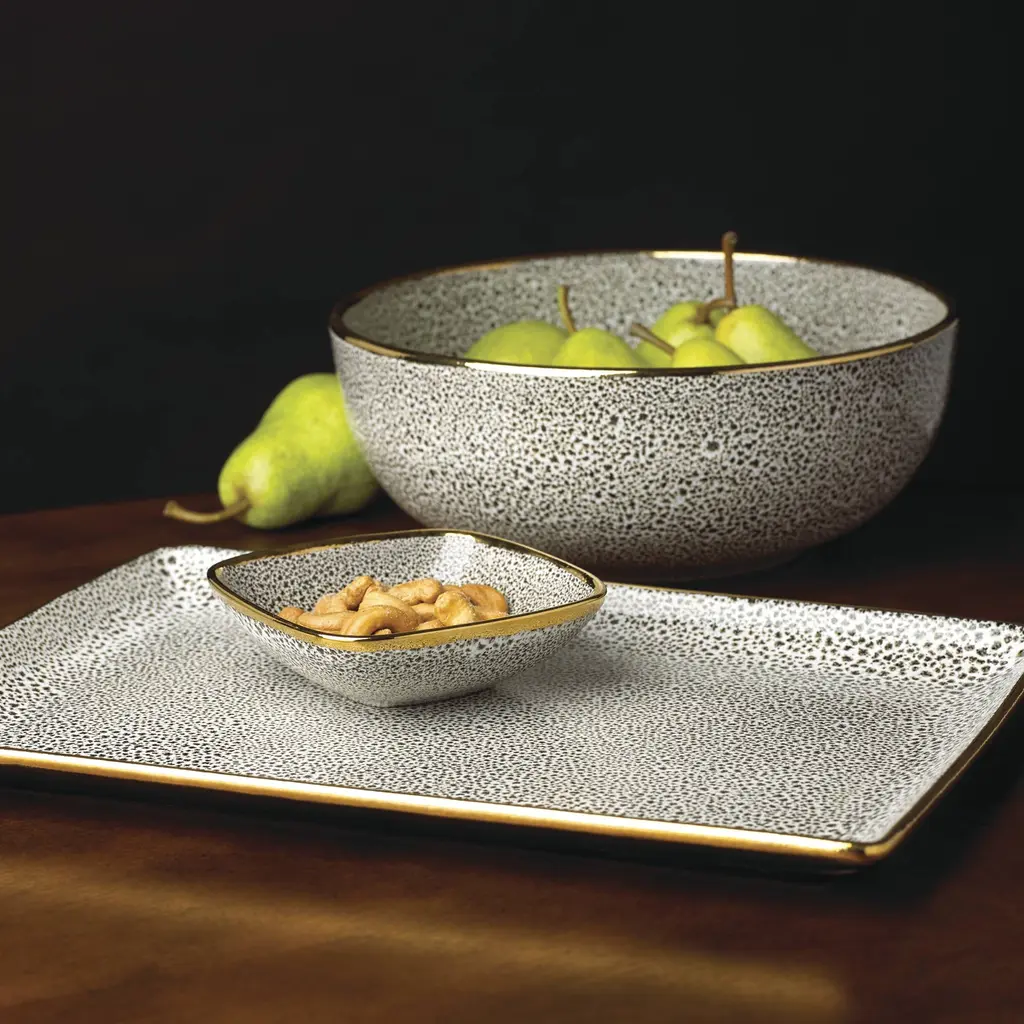 The Panthera Collection modernizes your tabletop with beautifully mottled porcelain pieces that combine form and function. 14K-gold edging adds a lustrous finish.