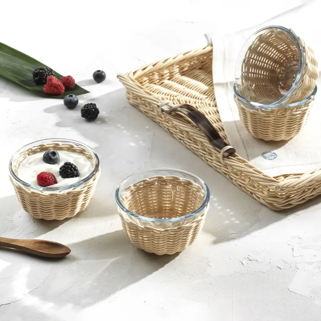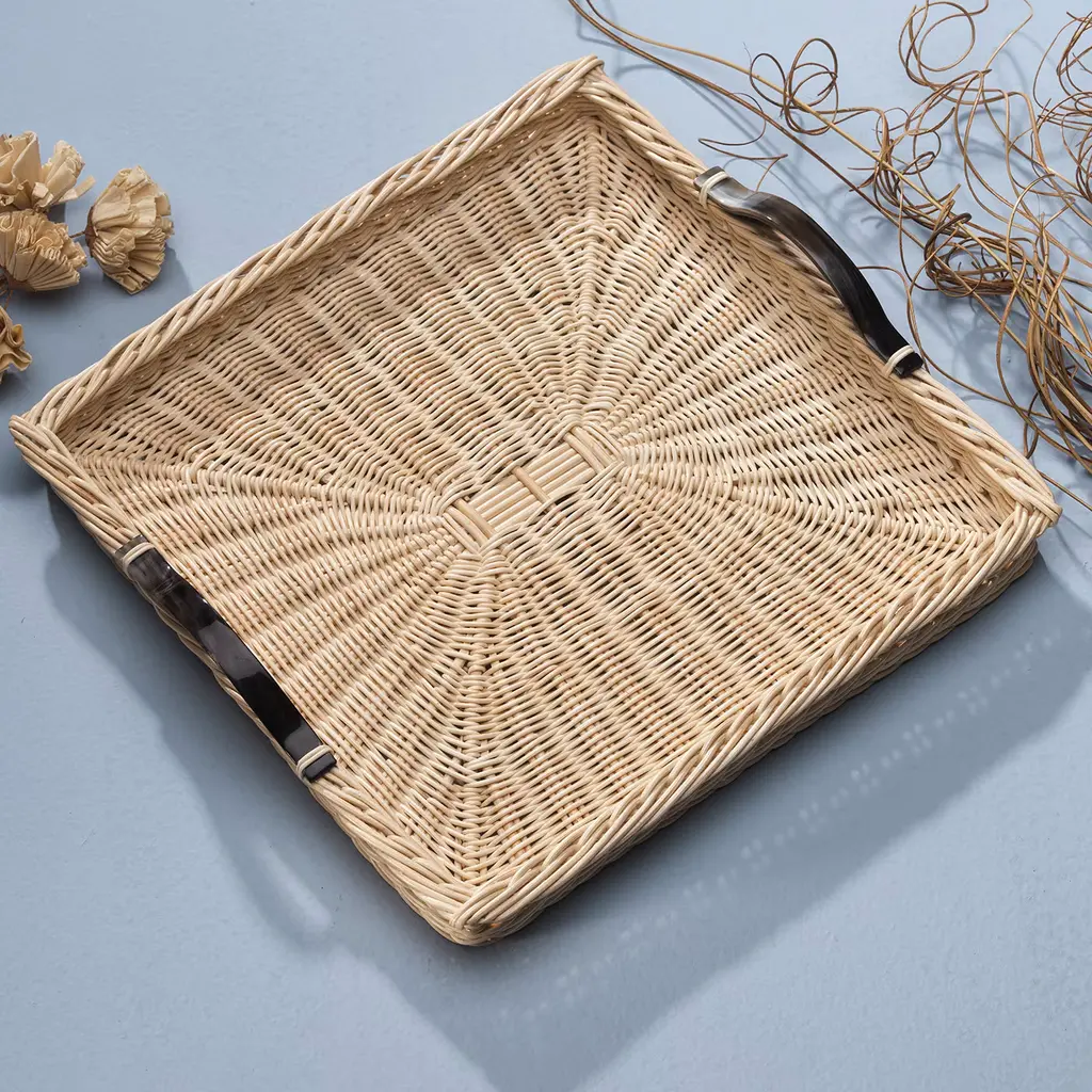 A masterful display of traditional craftsmanship, this stupendous wicker tray is a precious design piece of timeless value. It features a square profile with raised edges, enriched with refined handles handmade of natural horn, displaying singular veining that enhances the design's exclusivity. Please consult the Concierge for further details.