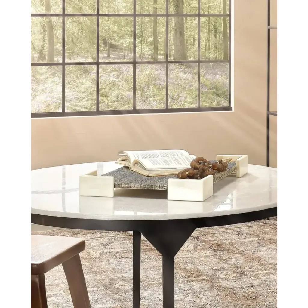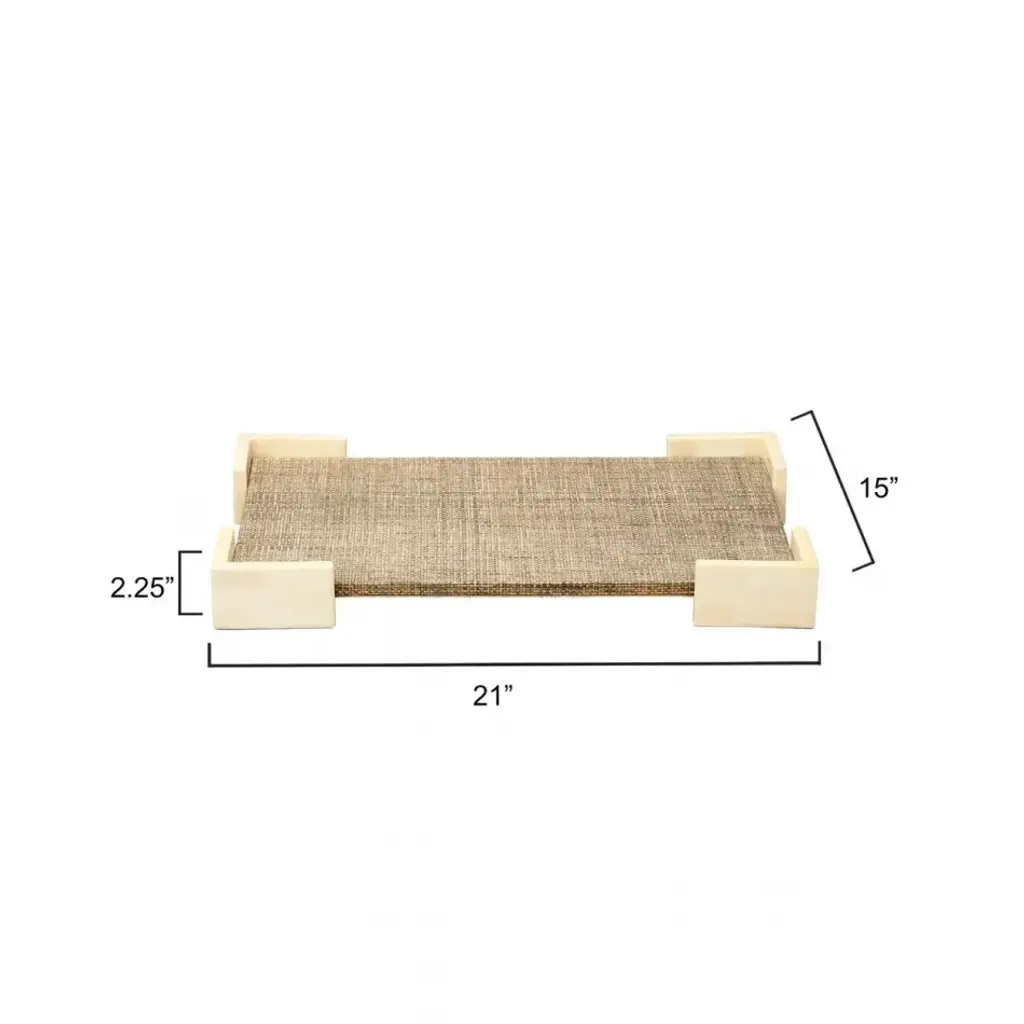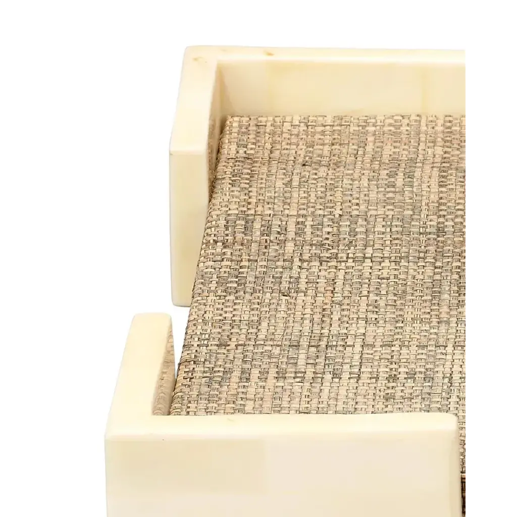 Beautiful bone is paired with woven raffia to create a decorative tray of unusual beauty. Lined with beige ultra suede, it can be piled with books or Topped with a collection of small decorative items. With an easily integrated neutral palette and bold but simple design, it also makes an ideal addition to a workspace.
