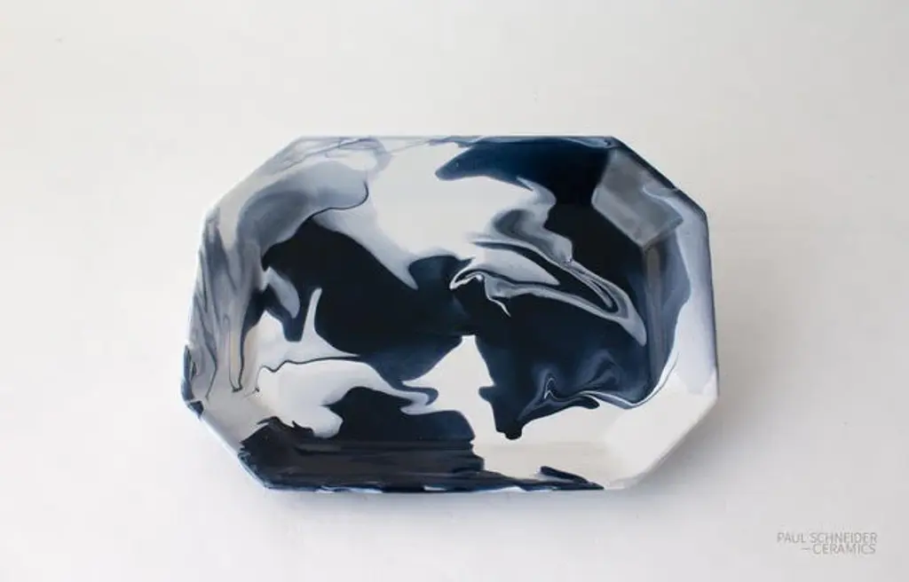 11.5”L x 8.75”W x 1.25”H Paul Schneider's exceptional hand-made pottery. This tray is perfect for apertif hour, as a decorative piece, or just part of your tablescape. A beautiful combination of blues.
